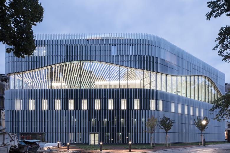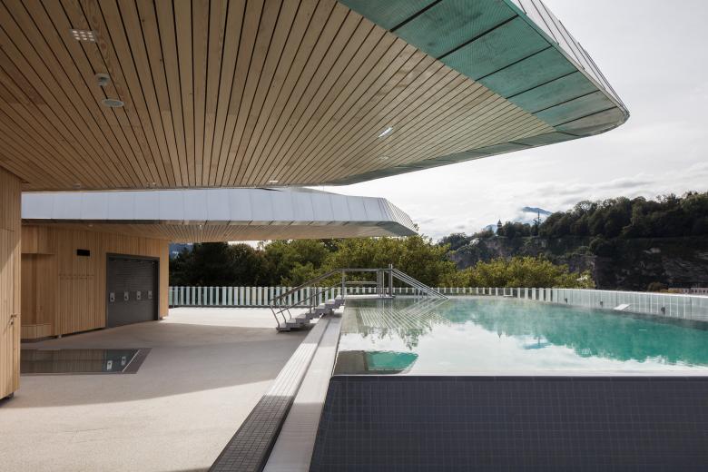 The "Paracelsus Bad & Kurhaus" was conceived as a three-dimensional landscape with the building’s main elements forming a clearly legible vertical layering. The rather introverted plinths of the bath contain on three floors the city's health and spa services and the pool's changing rooms. The entire roof level, used for the sauna facilities and their spectacular outdoor pool, features a view of the entire city. A layer of ceramic louvers surrounds the "Paracelsus Bad & Kurhaus", screening it from passersby.