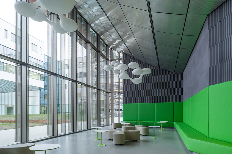 The building consists of two volumes, linked together by a glazed atrium. The ground floor is designed as transparent zone that opens up to the campus. It contains a multipurpose lecture hall on the west side which can be divided into three auditoriums or functions as one audimax. On the eastside there is a lounge for studying and communication that creates a view towards the campus, as well as a meeting room and secondary functions. The foyer situated in between the two volumes extends to the first floor.