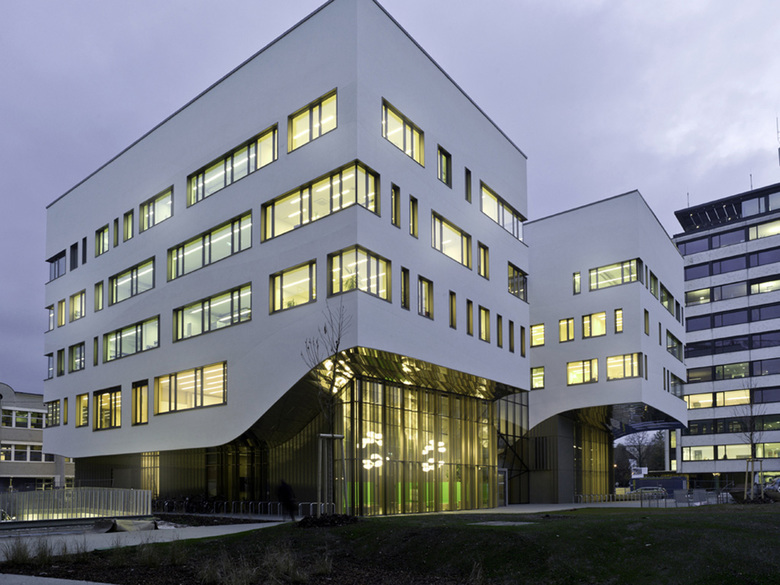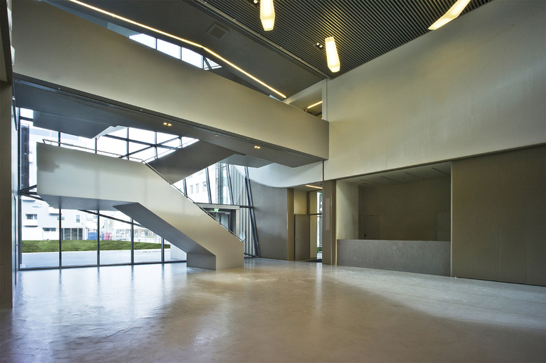 Sculpted staircases follow along the bended glazed façades. Lecture halls and the different departments with their laboratories and offices are located in the upper floors.