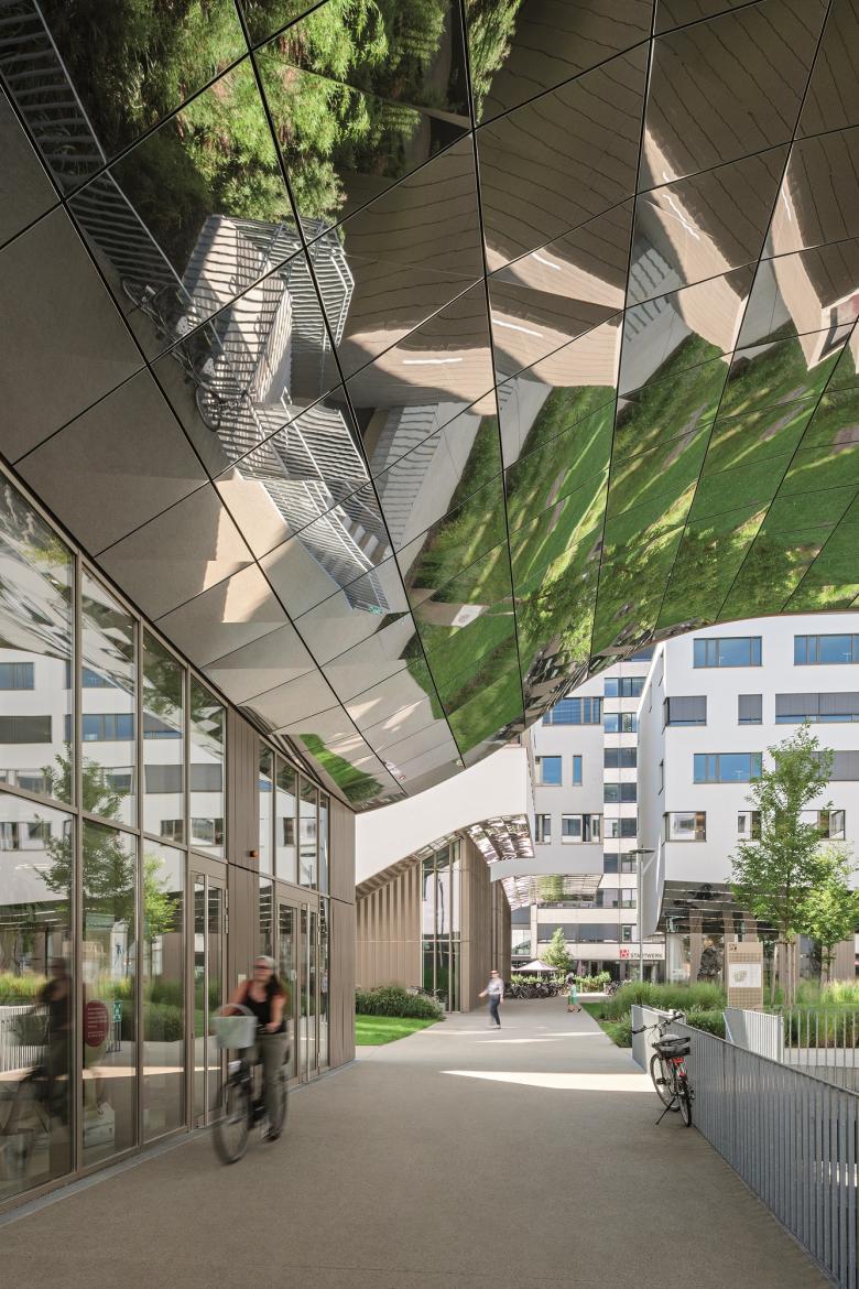 Die nach unten gekehrte Dachlandschaft wird zum bestimmenden, räumlich fassbaren Element und bildet mit der Gartenanlage des Campus eine Symbiose. Dieser städtische Raum generiert sich aus einem dreidimensionalen Diagramm. Die teilweise Überdeckung von Freibereichen durch die schwebenden Volumen lässt Arkade und Loggia zu einem neuen Raumerlebnis verschmelzen und erzeugt eine Tiefenschichtung des Raumes. An der reflektierenden Metalluntersicht der schwebenden Volumen scheint sich der Naturraum des Stadtwerk Life Scienes Campus zu verdoppeln.