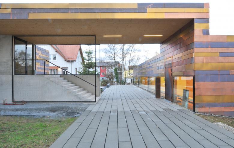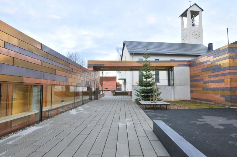 Durch stetig steigende Mitgliederzahlen wurde eine Erweiterung des Pfarrbüros der Evangelischen Kirchengemeinde notwendig. Der Erweiterungsbau, der die erforderlichen neuen Service-Räume aufnimmt, wurde auf dem Grundstück so platziert, dass zusammen mit den bestehenden Gebäuden, Kirche, Pfarr- und Gemeindehaus, ein vielfältig nutzbarer Freibereich entsteht und zur neuen Mitte für die Gemeindemitglieder wurde.