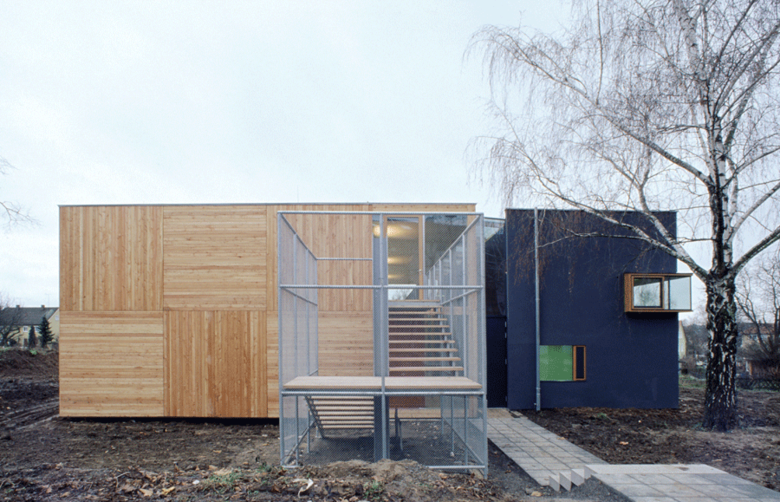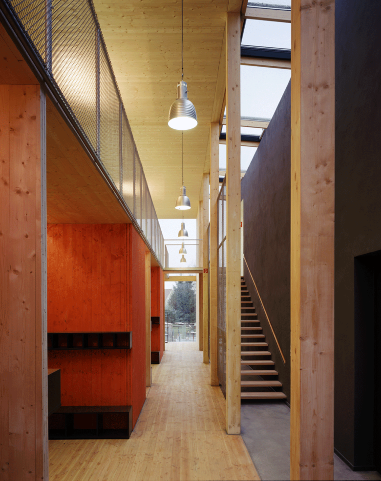 Um den wertvollen Außenbereich möglichst großzügig zu belassen, wurde das Gebäude 2-geschossig geplant. Innenräumlich eröffnen sich durch die Zweigeschossigkeit unterschiedliche Raumhöhen und Proportionen sowie optische und akustische Verbindungen zwischen den Ebenen, die in einem 1-geschossigen Kindergarten so nicht möglich wären.