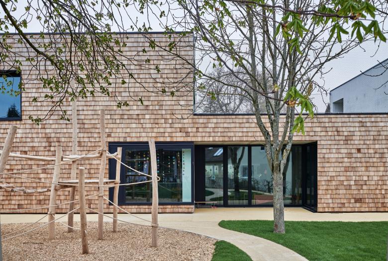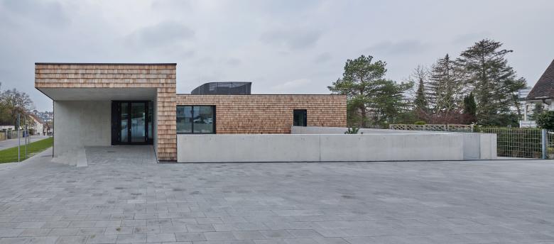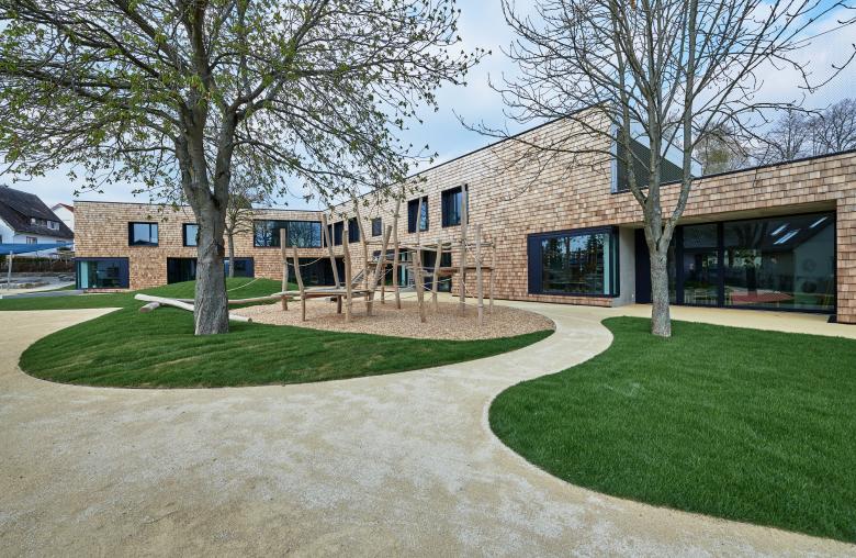 Während sich der Längsriegel des Gebäudes in den Hang hinschiebt verläuft der Ost-West-Riegel parallel zum Hang. Dadurch entsteht auf dem unteren Niveau des Gebäudes ein geschützter Außenspielbereich, der zum Friedhof hin abgeschirmt ist und den Blick nach Süd-Westen frei gibt.