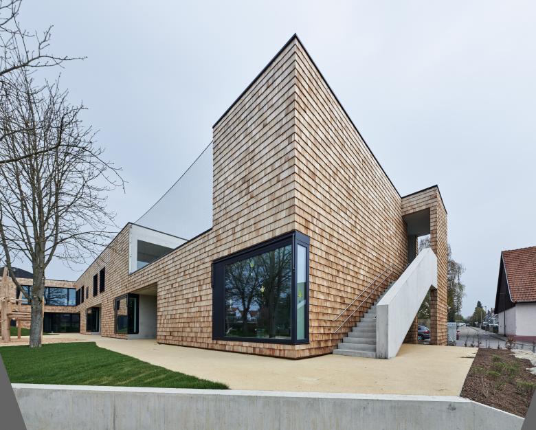 Der 2-geschossige L-förmige Baukörper wird mit seinem Längsriegel parallel zur Parkierung angeordnet und der Gehweg wird zwischen Gebäude und Parkierung verlegt. Dies ermöglicht das gefahrenlose Bringen und Holen der Eltern per Fuß, Rad und vom Pkw aus.