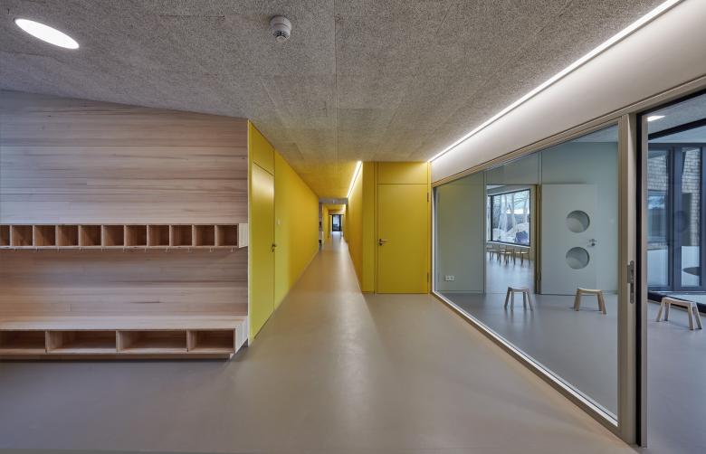 Über einen geschützten Eingangsbereich wird der zweigeschossige Neubau von Norden erschlossen. Nach Südwesten entstehen übersichtliche Garten- und Spielbereiche, denen alle fünf Kindergartengruppen ebenerdig zugeordnet sind.