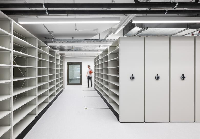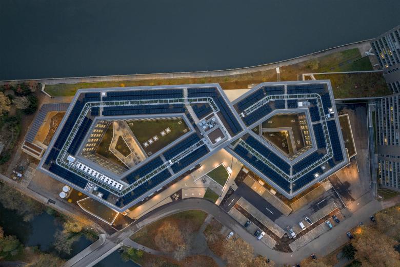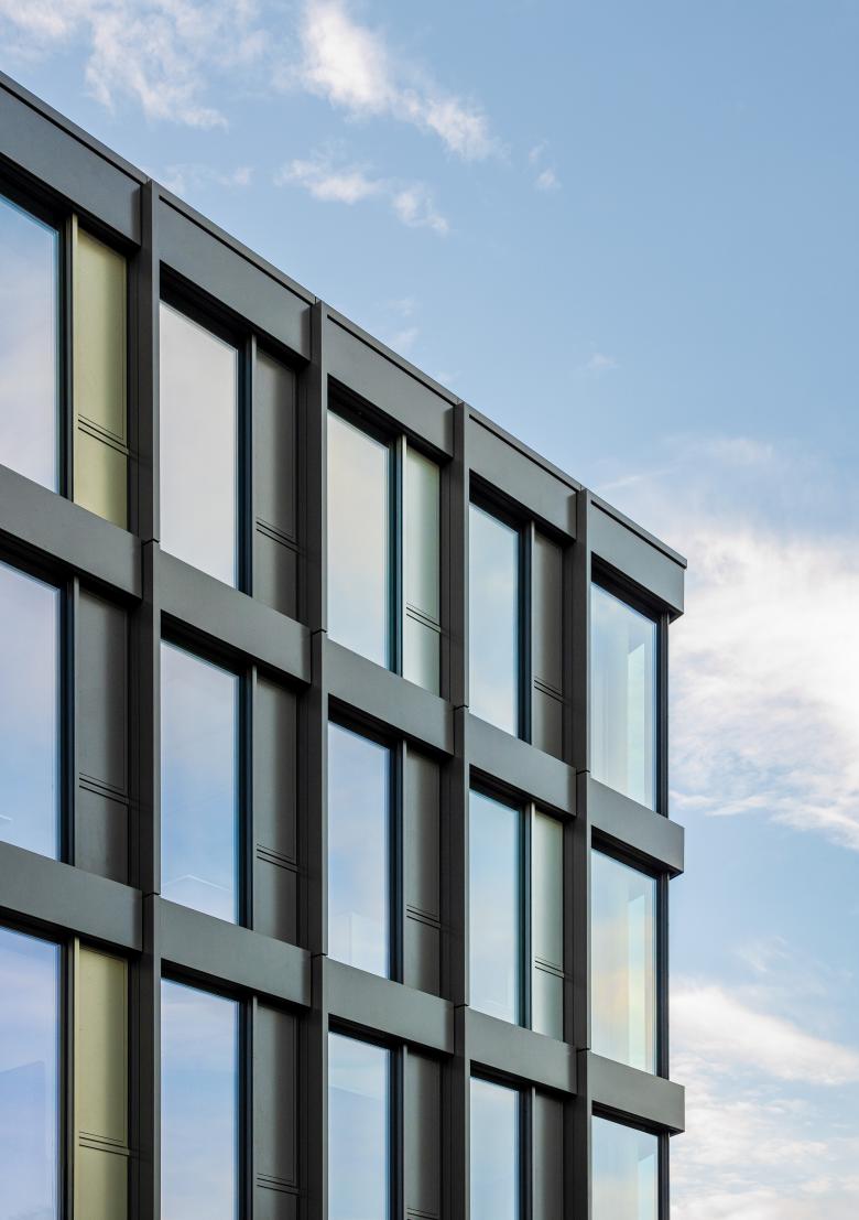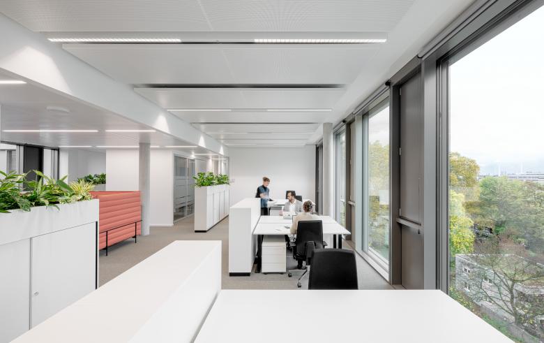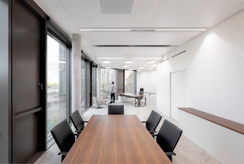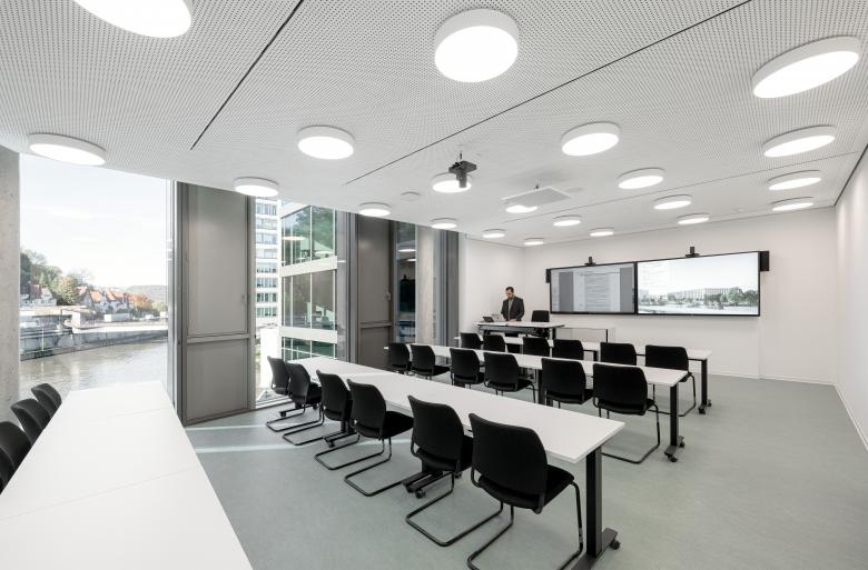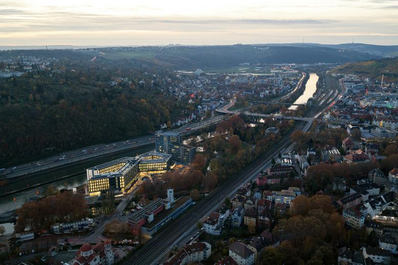 Für den Neubau wurde auf Basis der städtebaulichen Rahmenbedingungen die Form einer liegenden Acht gewählt. Diese besondere Gebäudestruktur bildet nicht nur eine charakteristische Silhouette, sondern schafft zugleich ein effizientes, intuitiv verständliches Erschließungssystem. Im Schnittpunkt der beiden Gebäudeschleifen liegt die zentrale Erschließung: ein räumlicher Knotenpunkt, an dem sämtliche Wege zusammenlaufen und an dem die interne Organisation klar ablesbar wird. Die unterschiedlichen Arbeitsplatzbereiche profitieren von dieser Gebäudetypologie: Der überwiegende Teil der Büros orientiert sich nach außen, mit direktem Blick auf den angrenzenden Park oder zum Neckar. Dieser starke Landschaftsbezug schafft helle, freundliche Räume mit hoher Aufenthaltsqualität. Ergänzend öffnen sich großzügig dimensionierte Innenhöfe zur Mitte der beiden Gebäudeschleifen. Diese ermöglichen Ausblicke auf die begrünte Dachflächen, die den Innenraum zusätzlich aufwerten.