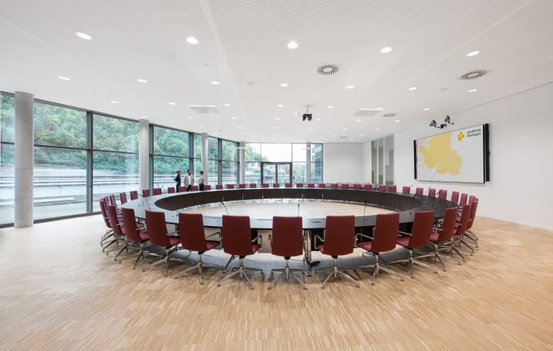 Der Neubau des Landratsamtes präsentiert sich als hochfunktionales Verwaltungsgebäude, das mit insgesamt 675 Arbeitsplätzen, 45 Beratungs- und Besprechungsräumen, sowie vielfältigen Funktionsräumen ein breites Spektrum öffentlicher und interner Arbeitsprozesse ermöglicht.