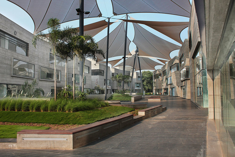 The architects built an ensemble with four buildings with a unique appearance. In the Indian sun the façade made of exposed concrete shimmers in variations of beige. It is structured by narrow, horizontal gaps – so, the buildings appear filigree despite their monolithic cubature. This impression is enhanced by the longish window elements.