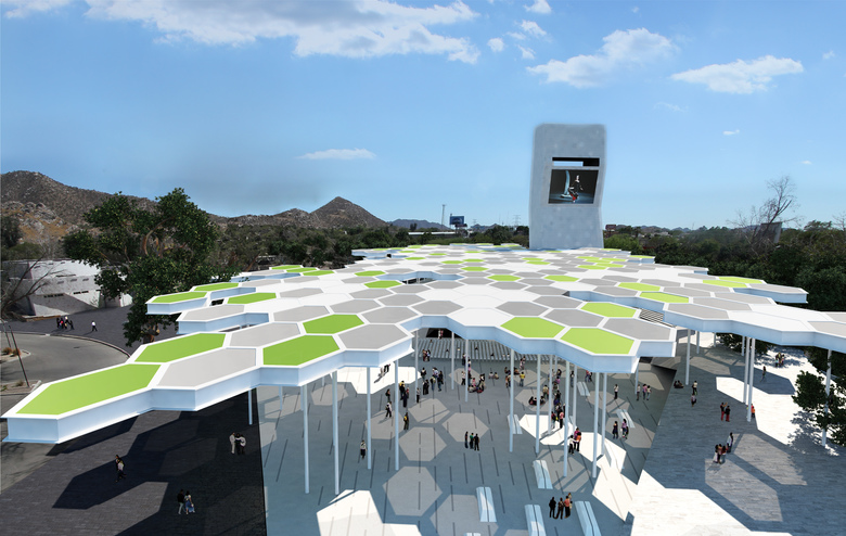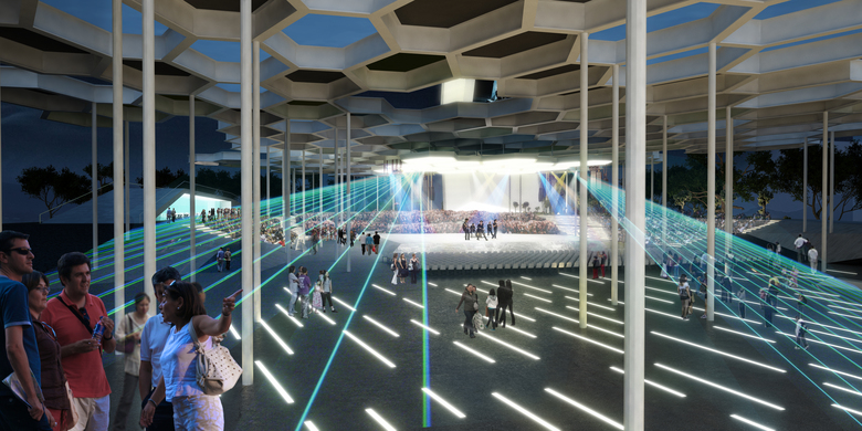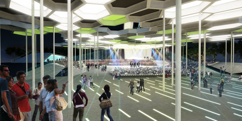 We set out to find this new configuration of the performance space. We extended a single flat roof comprised of hexagonal modules over the entire site. The roof is a single datum that does not acknowledge any one point below it as its focus. Below it we erect the traditional stepped surface of an amphitheater to allow visibility of the stage but these steps are collapsible to turn a traditional amphitheater into a free topography of gentle inclines. The fixed theatre is no longer present, as performance spaces are created and eliminated as needed in a more active appropriation of the theater.