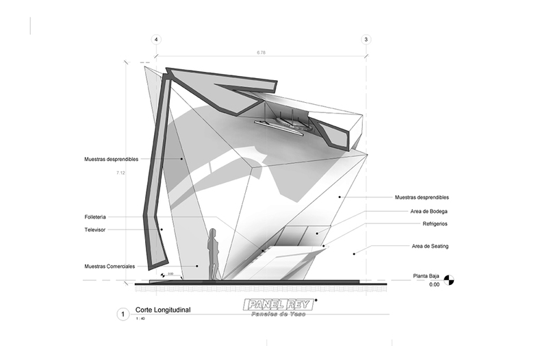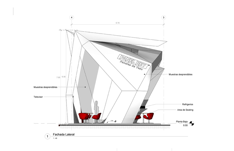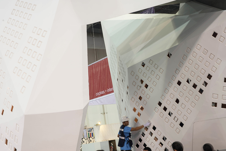 With this in mind, we approached the CEO of Panel Rey and convinced him to confront his competition by commissioning us a pavilion that would push the limits, design-wise, of what could be accomplished with gypsum panels. We partnered with Sanzpont [arquitectura] for this project and together we generated a whimsical and outgoing way to seek attention and leave behind the monotony of the exhibition halls. The pavilion is formed by a number of flat triangles that intersect in space to create an arch framing the central area while a six meters long cantilever protrudes over the top. The outside of the exhibition stand is covered with gypsum panels, the back column and the cantilevered structure are covered with exterior panels (Glass Rey) and the inside frame is covered with cement panels (Permabase).