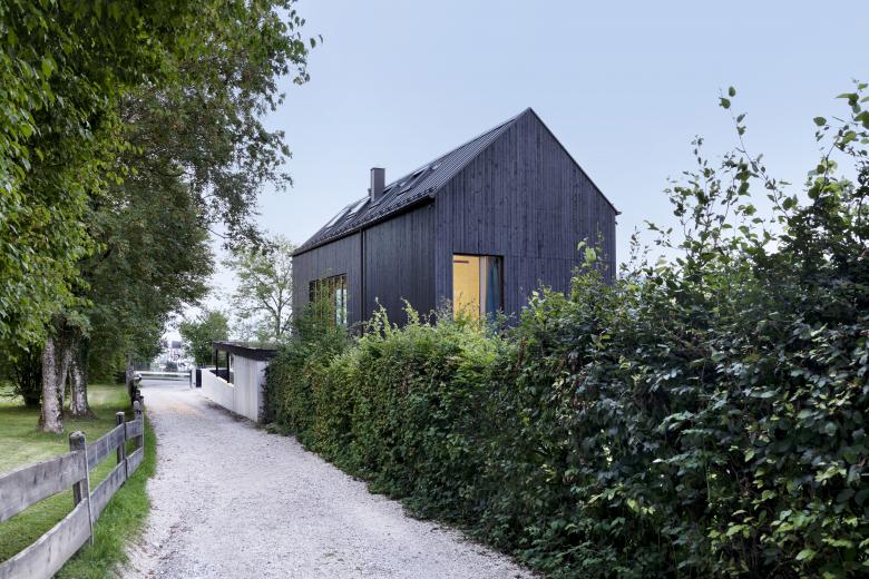 Auch nach außen gibt sich das Haus schlicht. Das Satteldach entspricht der Typologie wie man sie hier findet. Die klare Form des Holzbaus und seine schwarz lasierte Holzfassade nehmen Anleihe an den vielen Bootshäusern rund um den See.