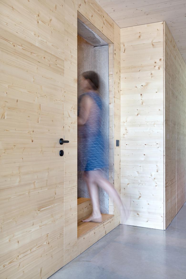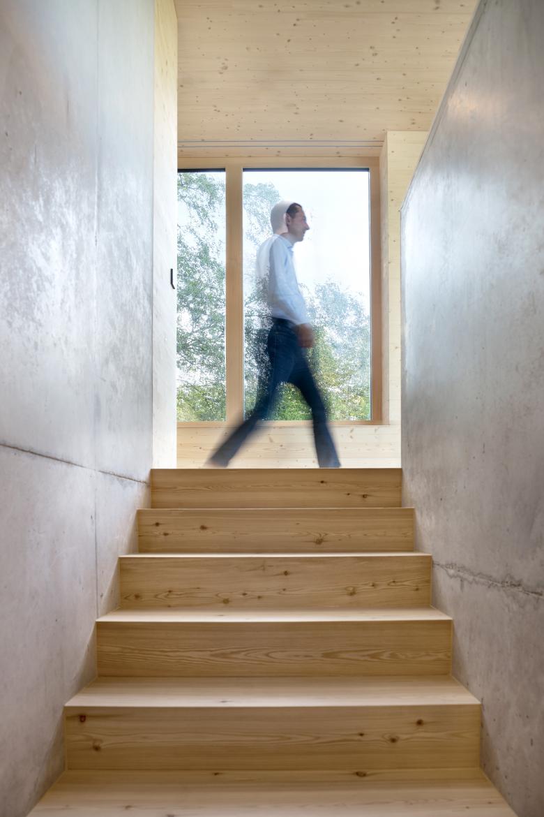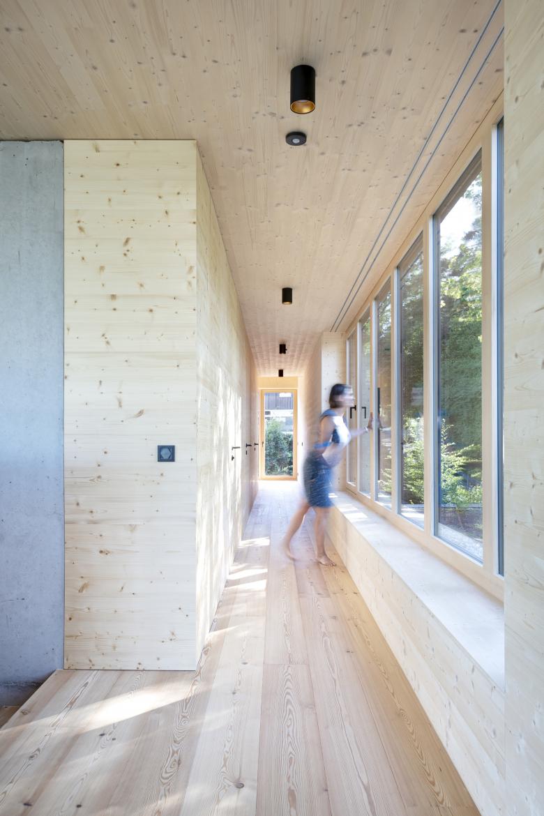 Viel Platz war nicht am kleinen Grundstück. Darum gab es auch nicht so viele Möglichkeiten, das Volumen zu platzieren. Das Haus ist schmal und lang und schmiegt sich an den westlichen Rand. So bleibt der Garten möglichst groß und gleichzeitig der Ausblick möglichst gut. Im Erdgeschoss richtet sich alles nach „innen“, in den Garten. Erst im ersten Stock wechselt das Haus praktisch die Orientierung und richtet sich zum See, über die davor vorbeiführende Straße hinweg. Wie ein Ausguck ist von hier alles zu sehen.