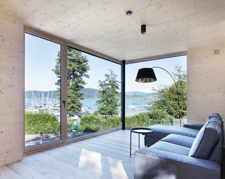Natürlich sind wir nicht am Meer, aber fast. Der Seeblick aus dem ersten Stock ist atemberaubend. Im Vordergrund schaukeln die Segelboote im Hafen, im Hintergrund der kitschig blaue Attersee und die Berge. Und ja, ländlich mondän ist das Haus auch. Im Garten ist es eher ländlich, im Inneren reduziert, ja fast asketisch. Außer schlichtem Holz, Beton, ein paar dünnen Stahlsäulen und viel Transparenz ins Freie gibt es nicht viel. In dieser luftigen, feinen Atmosphäre lässt es sich leben. Nur die Großstadt ist halt nicht gleich hinten, wie bei Tucholsky. Aber alles haben, das ist eben selten, wie der Schriftsteller und Journalist schon vor 100 Jahren so treffend feststellte.