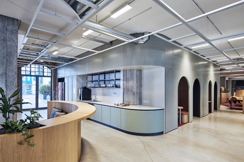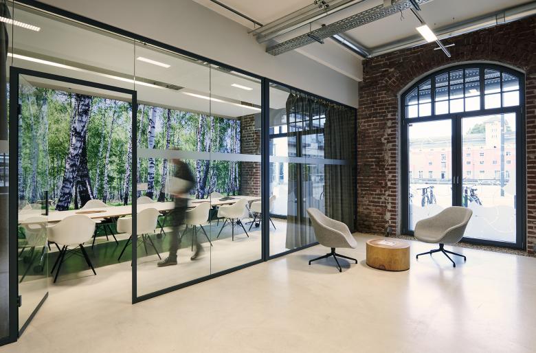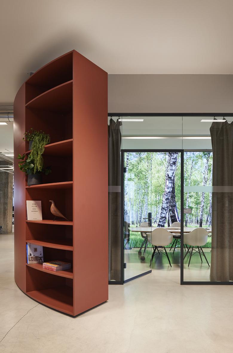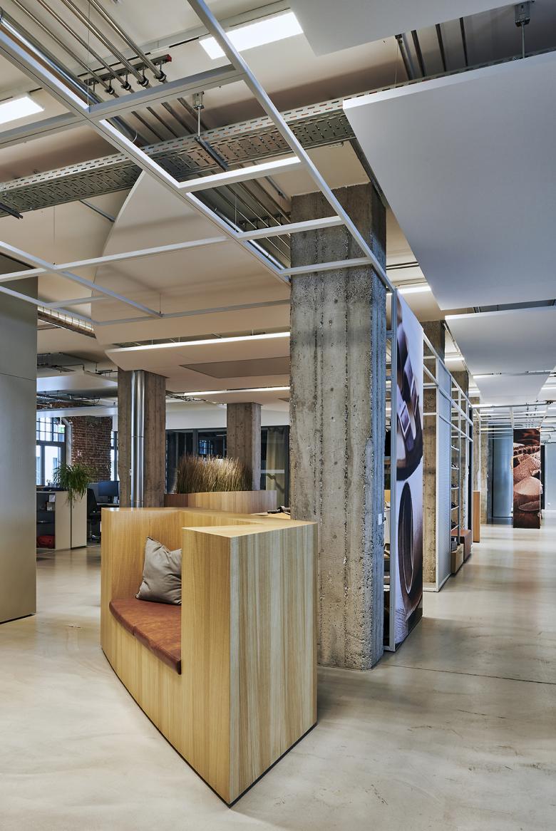 Within the framework of the historical warehouse halls, brandherm + krumrey developed a customised interior design for Birkenstock’s diverse requirements. The headquarters of the international fashion brand in the Rheinauhafen quarter provides over 2,000 square metres of open-plan office space for creative work. Around 150 fixed and flexible workstations are distributed over the ground floor and the four upper levels. Instead of open-plan offices, individual areas were created to cater to different needs. Particularly impressive are the ground-level Halls 11 and 12, for which brandherm + krumrey designed a modern working environment with a showroom. A historical cross vault and round columns made of reinforced concrete characterise the evocative ambience of Hall 11. Here, glazed and closed cubicles accommodate functions for individual and team work or meetings, so that the spacious impression of the room is maintained. Loosely arranged display furniture is additionally used as storage space for office purposes and as plant shelves. Showroom areas for the world-famous shoes were also created in the neighbouring Hall 12 and combined with workplace functions. New Work tables specially designed for the project complete the ensemble of high-quality furniture and carefully chosen materials. The centrepiece of the interior design are two circular, open meeting zones with seating arrangements and upholstered furniture that invite relaxed exchange in a special atmosphere.