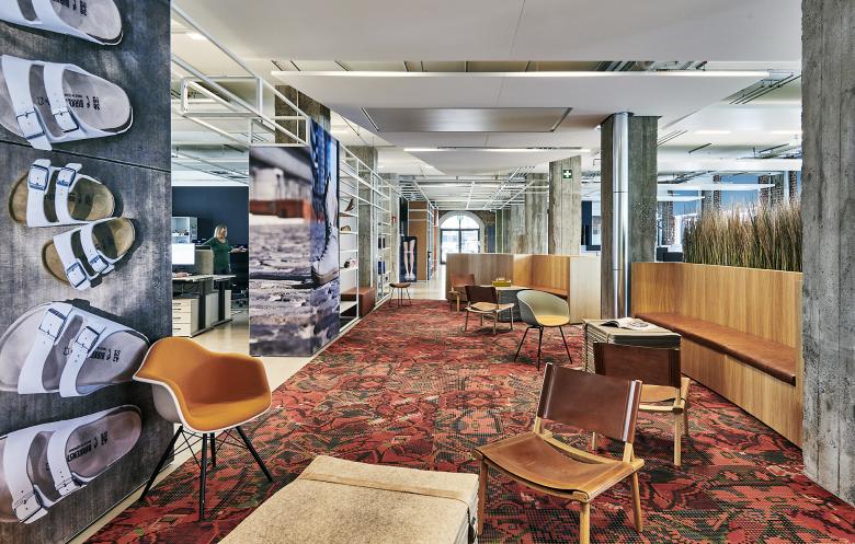 How can open meeting and office spaces for modern forms of work be integrated into a historical harbour warehouse? This was the exciting task facing brandherm + krumrey when designing the headquarters of the Birkenstock Group in Cologne. Areas for office work, meetings and coworking along with a lounge, café and showroom were to be accommodated in a former customs and warehouse dating from 1898. The elongated building in Cologne’s Rheinauhafen was originally used to store oils, fats and petroleum. Today, the imposing building is part of the ensemble comprising restored heritage buildings and modern architecture such as the well-known Kranhäuser (‘crane houses’) that characterise the old harbour area in the cathedral city.