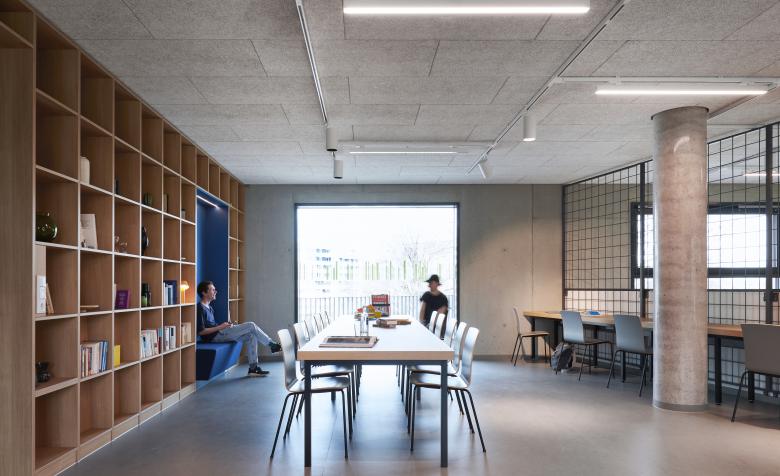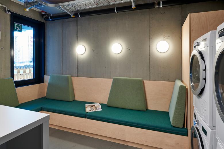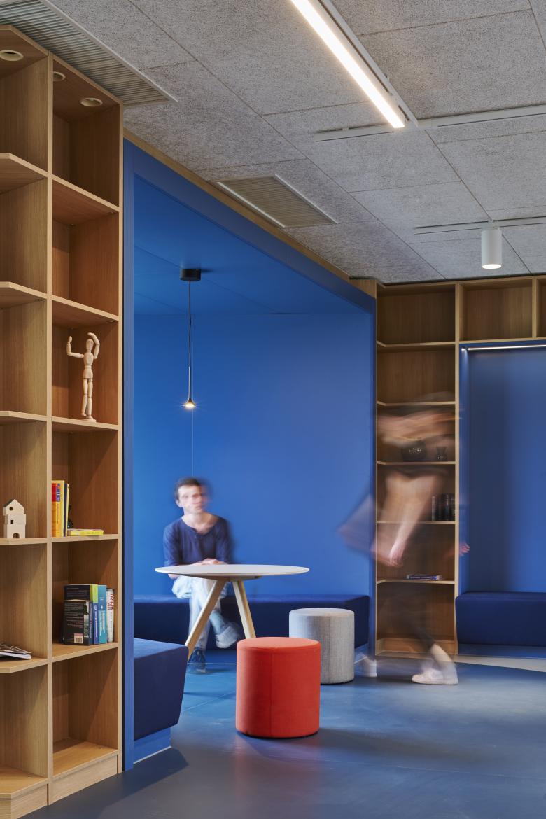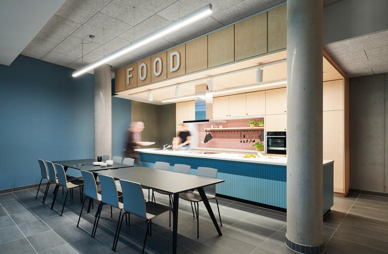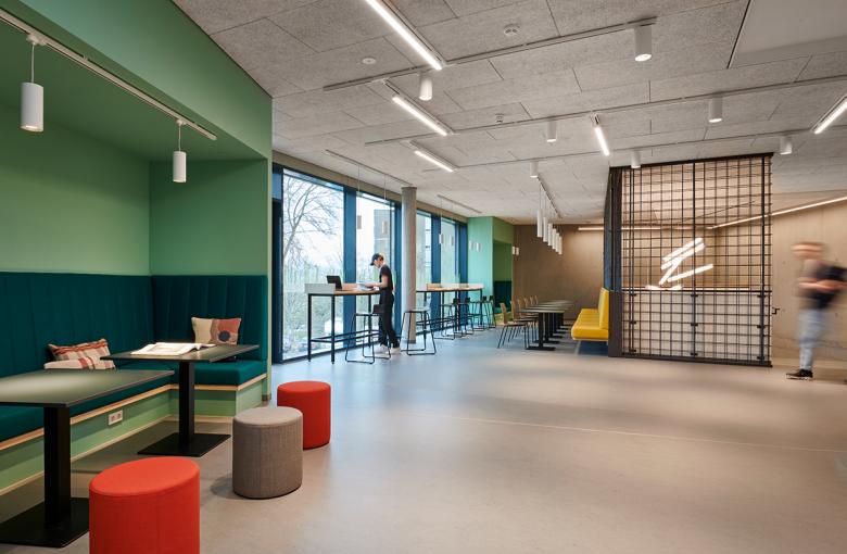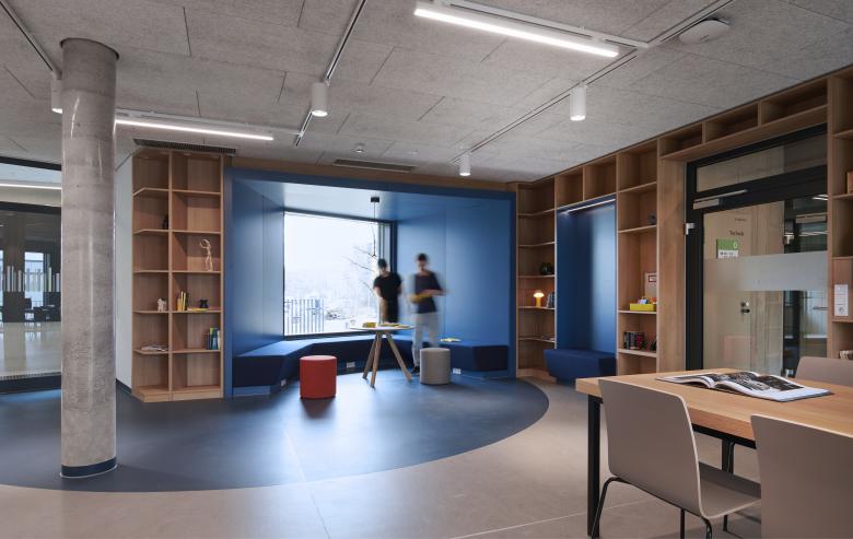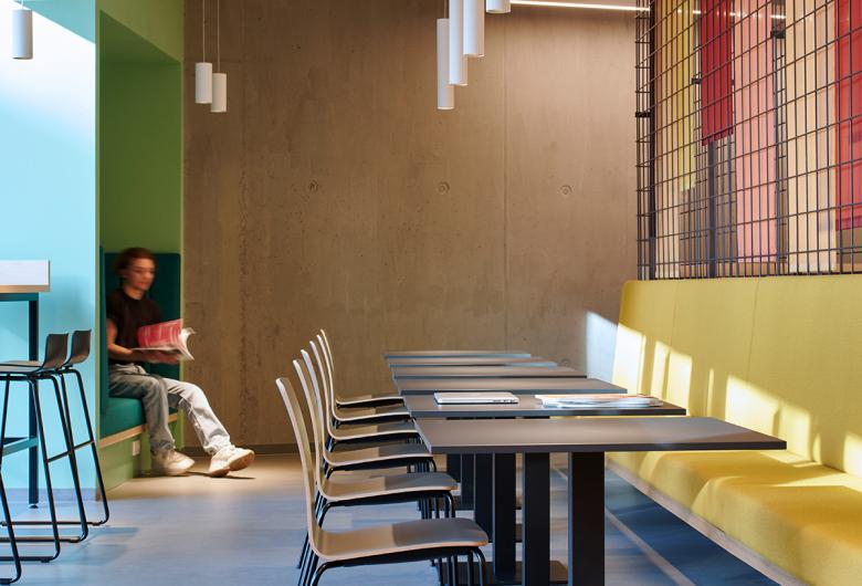 Gemeinsam Wohnen – Das von uns gestaltete Interior Design für das Studierendenwohnheim in Reutlingen beruht auf der Idee einer Wohngemeinschaft. Neben den 182 Zimmern sorgen großzügige Gemeinschaftsflächen für einen regen Austausch der Bewohnerinnen und Bewohner untereinander. Jede der offenen Flächen hat eine persönliche Note, um ein Wohlfühlambiente zu schaffen. Leuchtend warme Farbtöne prägen die Co-Living-Flächen und sorgen für eine bessere Orientierung. Das Studierendenwohnheim der GWG – Wohnungsgesellschaft Reutlingen mbH wurde nach einem Entwurf des Architekturbüros be_planen errichtet. Der klassische Eingangsbereich im Untergeschoss bildet ein freundliches Entree ins Gebäude, das auf allen Etagen offene Kommunikationsflächen bietet. Für jeden Anlass des Zusammenwohnens gibt es einen eigenen Bereich. So befindet sich im Untergeschoss die Gemeinschaftsküche mit einer Loft-artigen Fläche, die zum Essen oder auch zum Lernen genutzt werden kann. Die Bibliothek lädt mit Lesekojen in ruhigem Blau zum konzentrierten Arbeiten ein. Wer sich zurückziehen möchte, findet in seinem Apartment eine Küchenzeile und eine Nasszelle. Die Einrichtung verbindet ein klares und zeitloses Design mit warmen Holztönen für ein wohnliches Ambiente. Ausziehbare Betten und Einbaumöbel sorgen für eine optimale Nutzung der vorhandenen Zimmerfläche. Zwischen den einzelnen Wohneinheiten befinden sich Co-Working-Spaces für das gemeinsame Studieren. Die einladende Atmosphäre mit farbigen Nischen und Sitzpolstern fördert auch hier eine lebendige Gemeinschaft.