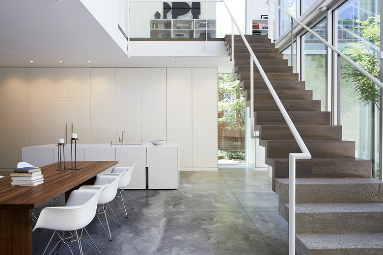 Conversely, the brick at the Thayer House is highly visible and featured as a prominent design element. The street facade is organized in vertical twisting columns to create an ever-changing pattern of opening and closing as light moves across and thru the facades. As the viewer passes by the home, the façade creates a moire-like pattern that appears to be constantly in motion. Depending on one’s location, the porous courtyard façade courtyard can appear open and welcoming while also feeling closed and private. This allows glare free daylight to penetrate into the building through glazed surfaces behind them, as well as creating a glow from within when the lights are on at night. Light seeping through the brickwork produces a shifting geometric pattern of light and shadow on the walls and floors of the rooms, circulation areas and neighboring structures that alters throughout the day.