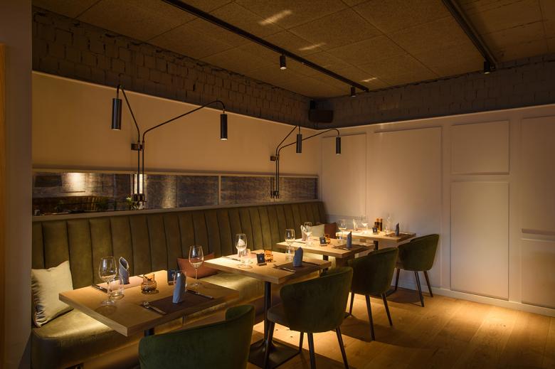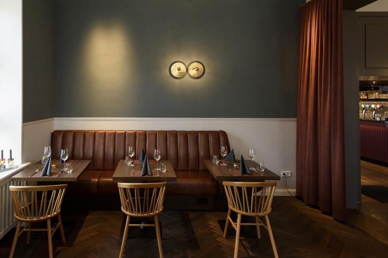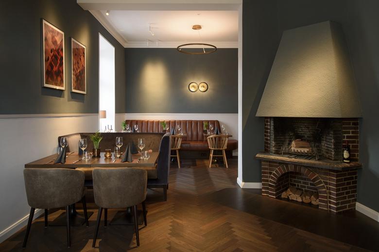 The restaurant is designed in Nordic style with clear lines and warm natural tones. This style runs smoothly with a gradually shifting colour spectrum through the sequence of rooms of the old, listed building The Hauptwache from 1692 and the extension built in 1980. Above all, valuable and old regional materials are used, such as grey-brown Öland natural stone slabs, the "Baltic marble" since the Hanseatic period, oiled or smoked oak, brass, leather and coarse linen fabric. Complementing these are brush-lacquered wood, high-quality upholstery fabrics and handcrafted tiles, creating a harmonious blend of rustic and refined elements. The reduced interior design with its material and colour scheme creates a sensual atmosphere and at the same time pays homage to the place and its history.