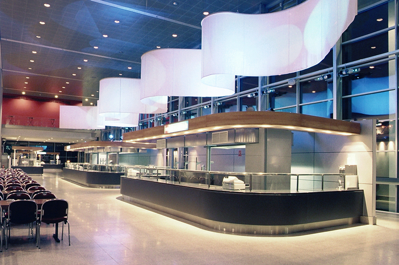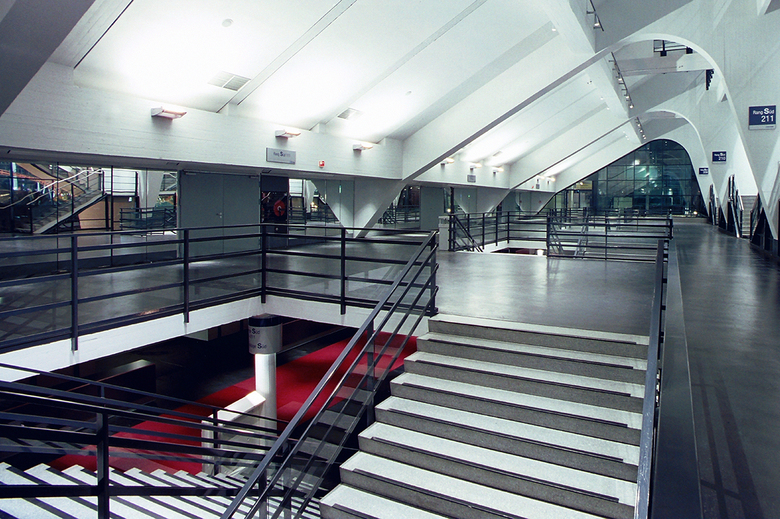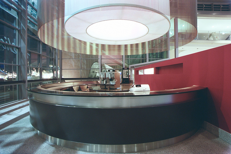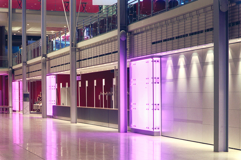Ein riesiger leuchtender Zylinder fasst den Raum oberhalb der gastronomischen Einheit im Süden des Foyers, wodurch - im Hinblick auf die Fernwirkung - die Achse des Hauptzuganges zusätzlich betont wird. Die bewusst zurückhaltende Verwendung von Materialien begünstigt eine veranstaltungsbezogene Inszenierung durch Akzentuierungen von Lichteffekten wie etwa die farbige Hinterleuchtung der Container-Stirnflächen oder durch Projektionen auf Lichtband und Screen.