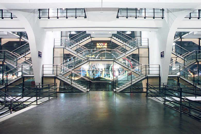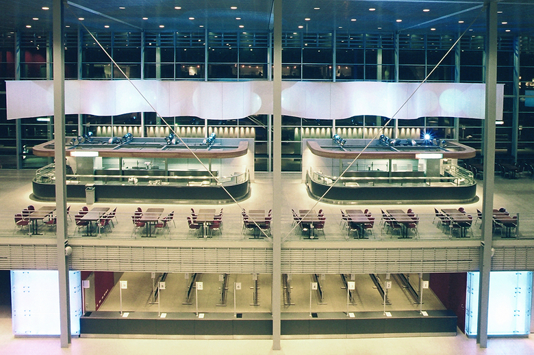 Von den beiden Haupttreppen aus wird der Blick des Betrachters auf einen Screen gelenkt, der die dahinterliegenden Technikzentralen ordnend überdeckt. Neben der Integration einer Rückprojektionsfläche macht dessen semitransparente Oberfläche die sich hinter dem Screen bewegenden Menschenströme sichtbar. Die Lust am voyeuristischen Erleben der Besuchermassen wurde hier zum Thema gemacht.