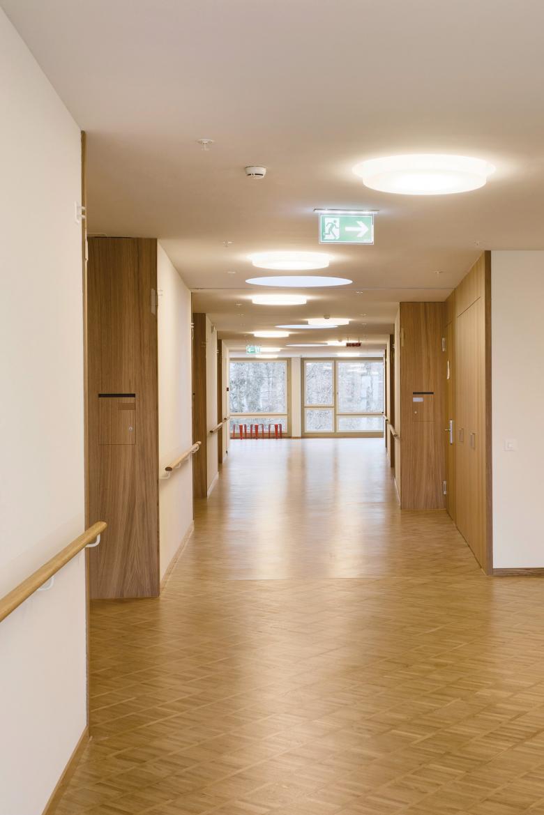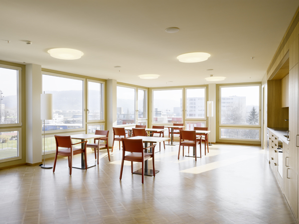 Durch die geschickte Abwicklung des Gebäudekörpers gelingt es, die Identität einer Gruppe zu generieren. Mit den Aufenthaltsräumen mit anliegendem Büro werden die Zimmer und die Erschliessung einer Gruppe zur Einheit verbunden. Die Zimmer sind gegen Süden, Osten und Westen orientiert. Die Aufenthaltsräume dienen den Bewohnern als Rückzugsort, verbreitete Gänge und Nischen als erweitertes Wohnzimmer. Das grosszügige Erdgeschoss ermöglicht Kontakte zu aussenstehenden Personen.