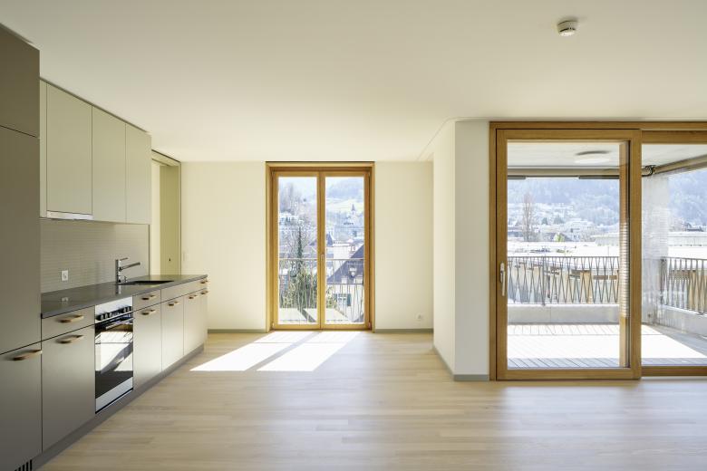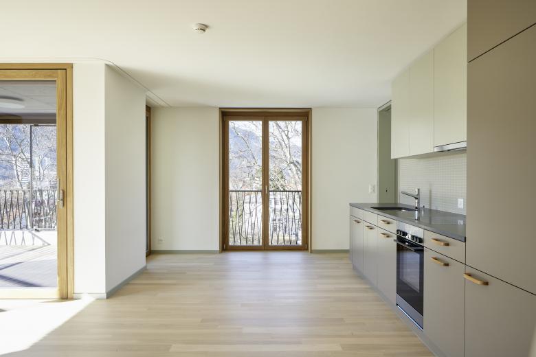 Das hohe Haus definiert in der Gesamtanlage mit dem gleichhohen Residenzneubau einen klaren Ankunftsort, von dem aus die Residenzwohnungen, das Altersheim und die neuen Alterswohnungen des Rigaparks erschlossen werden können.