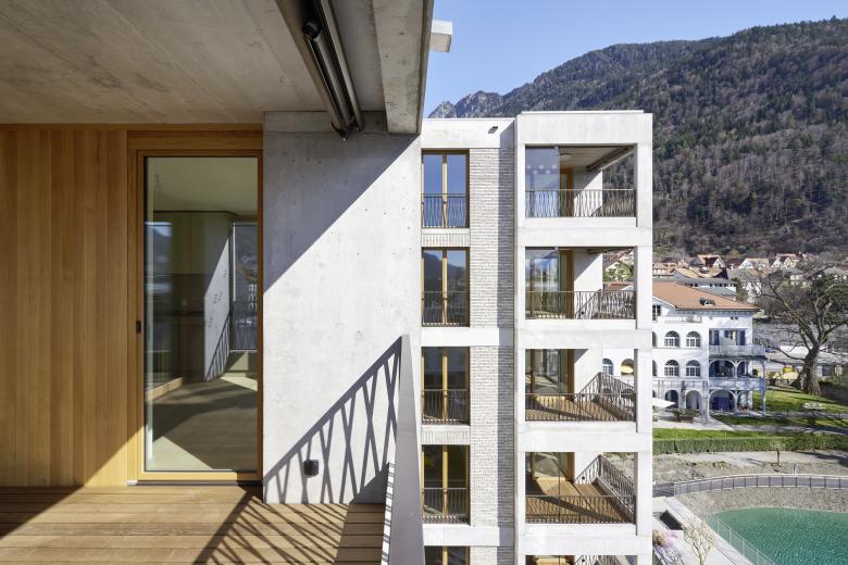 Das bestehende Gebäude des Rigaparks aus den 70-er Jahren wird durch einen siebengeschossigen Neubau plus Attika ersetzt. Das neue, gestaffelte Volumen ergänzt die Gesamtanlage in Anlehnung an die beiden Residenzneubauten im Osten des Seniorenzentrums Rigahaus. Das Gebäude steht an der Gürtelstrasse und stuft sich zum Garten in Richtung Süden.