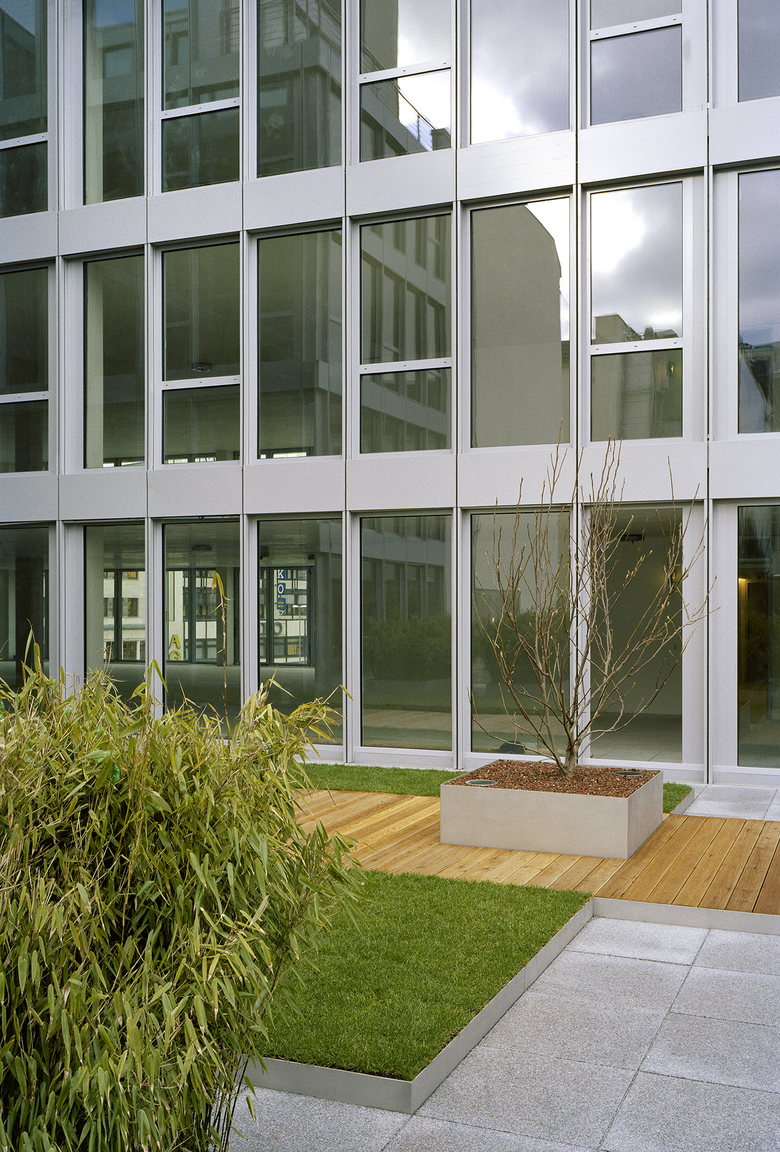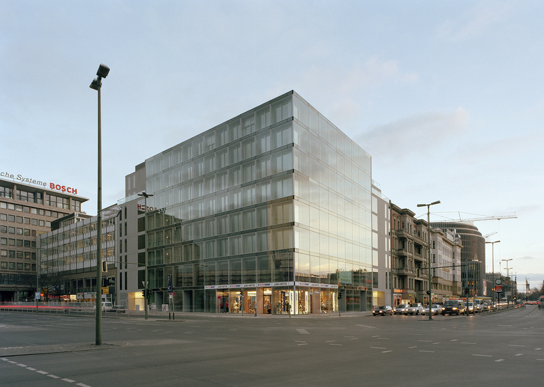A glass cube, light, transparent and shining, yet at the same time having a surprising materiality and minimalist power, defines this prominent city block corner near the Kurfürstendamm. It is made up of the newly developed „cell facade“, a further development of the double skin facade in technical, building physics and architectural terms. This is part of the buildings overall ecological concept. It saves energy and improves thermal comfort in winter, and there is soundproofing with natural window ventilation at this busy traffic junction
