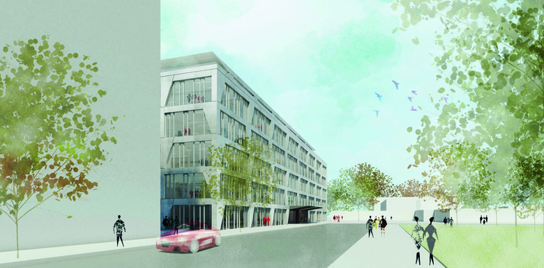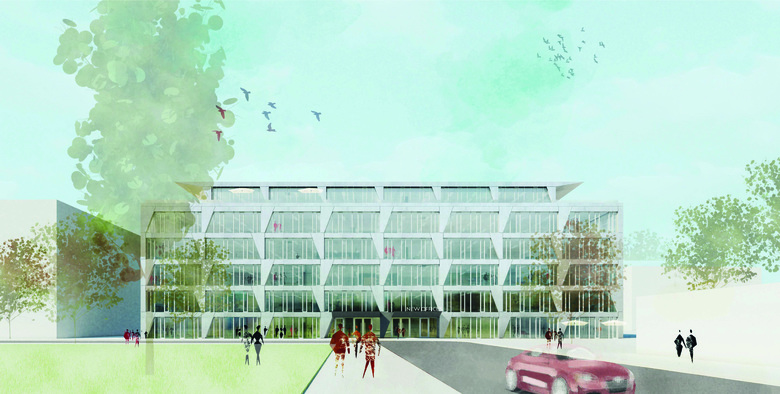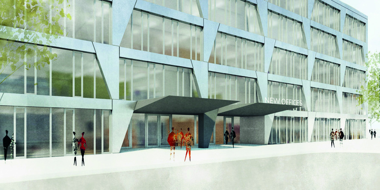 In Friedrichshain realisieren wir nun das erste .comhouse®. Es hat eine Gebäudetiefe von 23 Metern und eine Länge von 68 Metern und erreicht mit einem zentralen Erschließungskern eine Effizienz von 92 % (MF/BGF). Das weitspannende Tragwerk unterstützt die Flexibilität. Die imageträchtige Fassade mit einer Bekleidung aus feuerverzinkten Blechen verortet das Gebäude in seiner informellen, vom Aufbruch geprägten Location. Das Gebäudetragwerk definiert das Gestaltungsmerkmal der trapezförmigen Stützen: Deckenspannweiten werden an der Fassade verkürzt und maximale Fensterflächen für Tageslicht beibehalten.