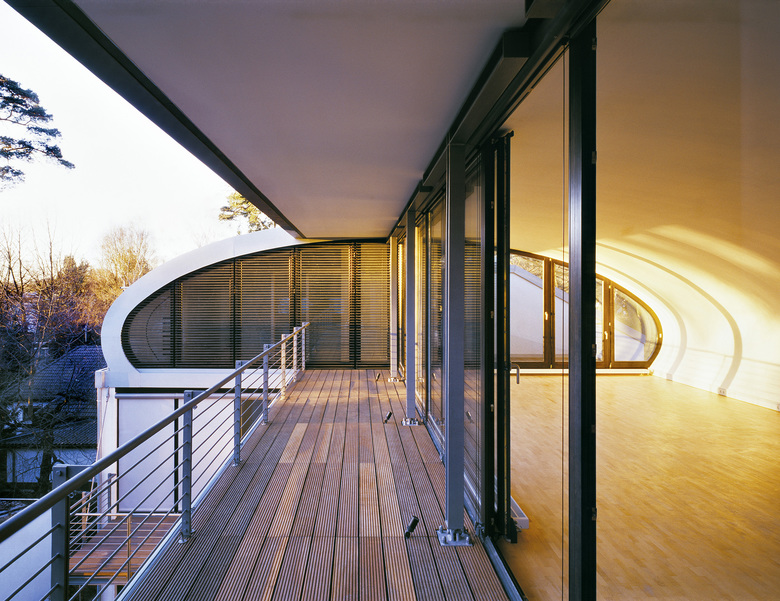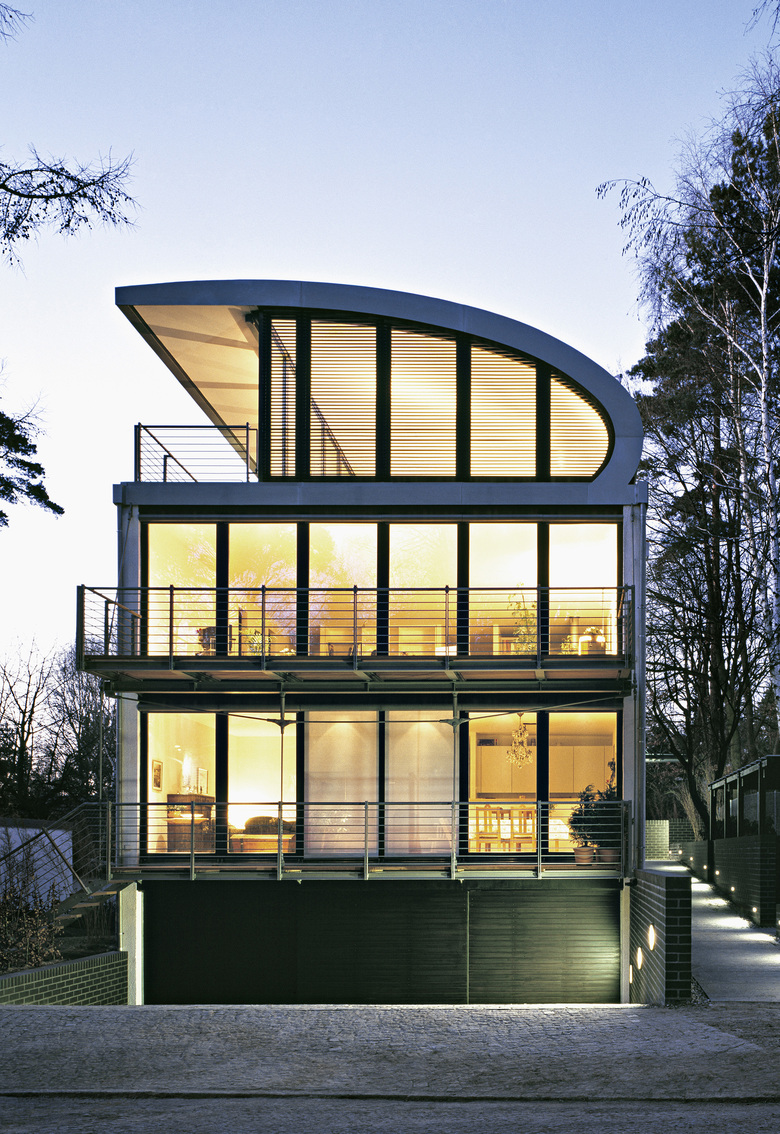 This project represents a so-called "Urban Villa", a very popular building type in Berlin during the 1990’s, otherwise often realized in a half-harted "retro-style". Comprising 5 freehold apartments, this building in a densely wooded location was conceived with a consistent modern design approach and an emblematic contemporary architecture. The evocative roof shape is formed from monocoque-shell elements and creates maximum living room volumes within the space allowed by planning regulations. The built volume is staggered in depth and fits in with the surrounding single family houses. Each of the five apartments has windows on all sides. Floor plans can be flexibly altered for the long term through the use of design features such as wide-span ceilings and non-load-bearing inner walls.