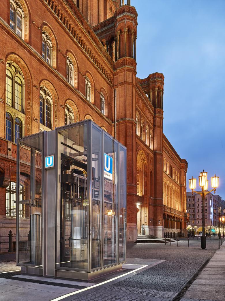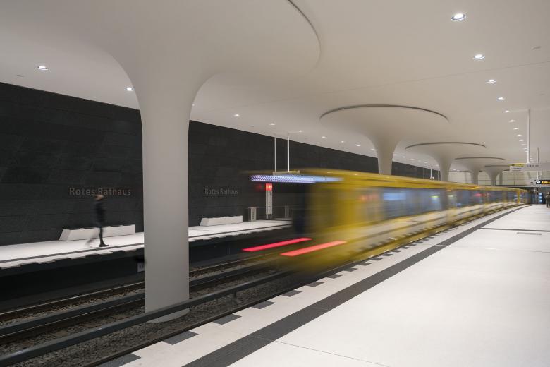 In 2010, archaeological remains of the first Berlin City Hall from the Gothic period were excavated. In order to preserve them and integrate them into the design, another redesign was needed. The new design identity of the station is now created by a strong spatial concept, an expressive mushroom column structure and through the materiality of the walls. The structure is inspired by the gothic principle of load transfer. The walls are made of sanded and polished terrazzo panels, an innovative material application. The design communicates the idea of movement and dynamics of the underground light rail. Clarity and personal sense of security remain fully intact, brightness and wellbeing spring from the modern clarity.