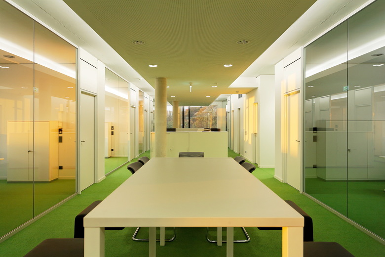 Technical concept – Integral planning component of the house-technical draught is the central atrium which fulfils a determining exhaust air function and allows the exposure of the inside lying workspaces with natural daylight. The supply of the fresh air occurs about a ventilation system in connection with a highly efficient warm recovery. When required the ventilation air is preconditioned about the ground water, the postheating energy is made available by a ground water heat pump. About the guidance of the ventilation air by special aircanals within the concrete ceilings the masses of the construction body are activated and perform thus an essential portion to the space climate. The solar protection occurs about outside positioned solar control louvres with a daylight steering system in the upper third of the hangings. The whole lighting of the building is optimised on your efficiency and is linked up with movement and daylight sensors.