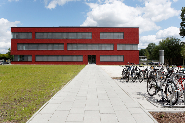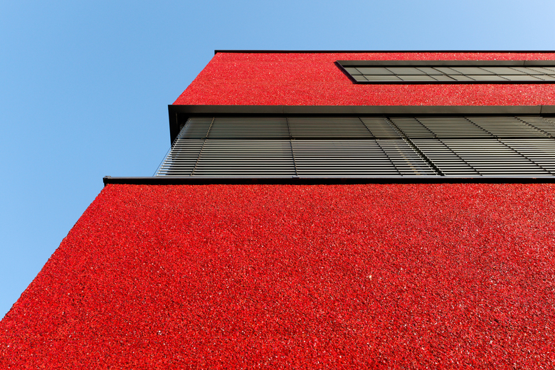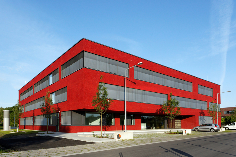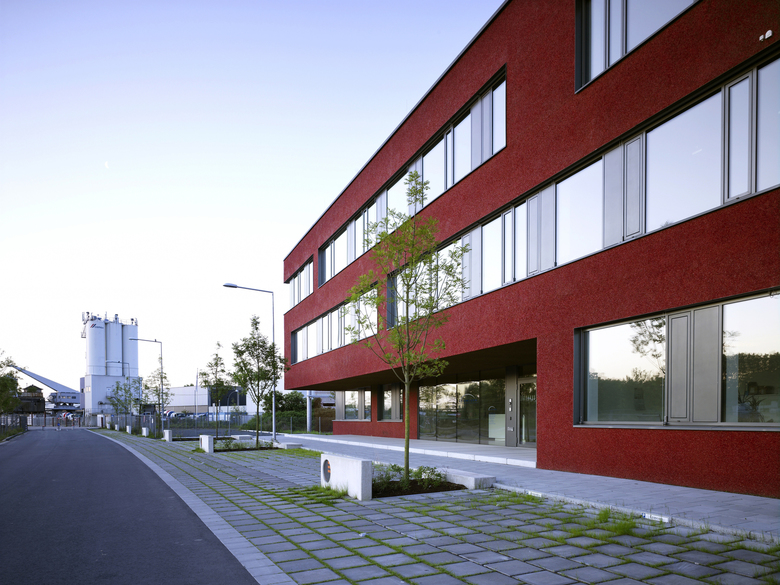Facade – The external covering of the highly insulated facade exists of a red cladding in which a surcharge of red, broken glass was trained. The glass granulate material allows the cubic body to radiate and glitter in the sun. By this material use the building is integrated harmonically in the site of existing red brick buildings but keeps it´s uniqueness. The facade clothing was applied in this form for the first time with a building project of this scale.
