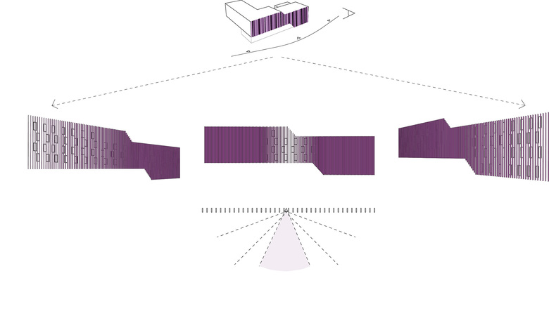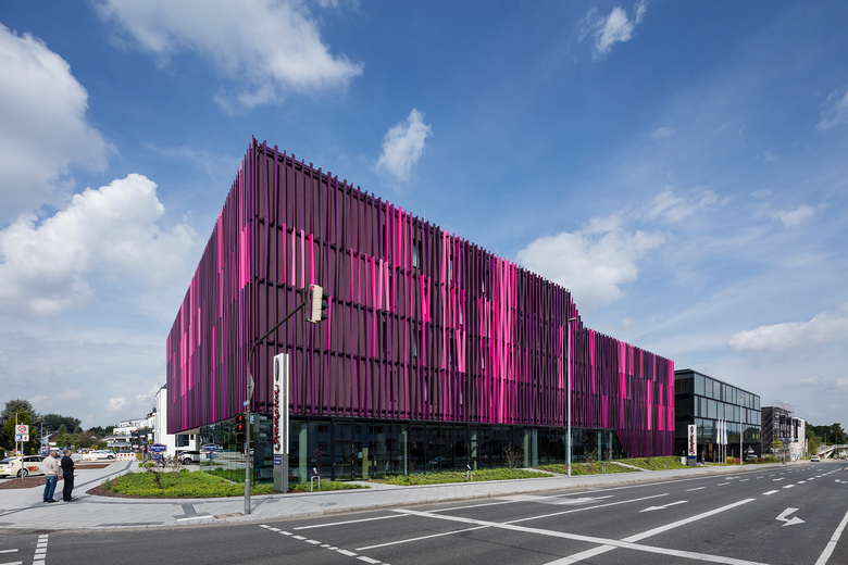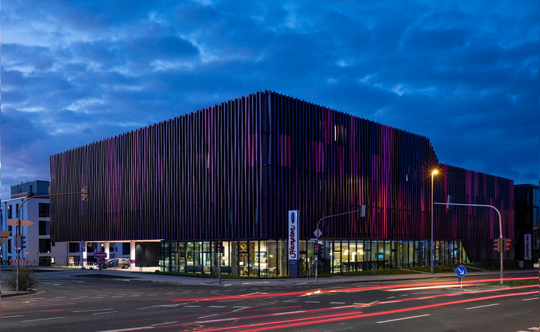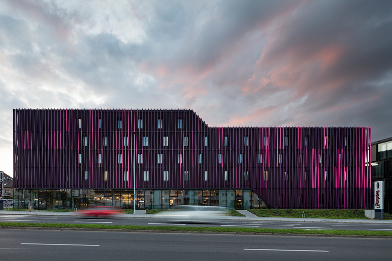 The hotel´s outstanding and memorable constitutive criteria is the custom made curtain wall made of three-dimensionally shaped aluminum sheets. They are vertically arranged – breaking through the punched window façade´s stringent rhythm and creating a subtle dynamic through their varying dimensions. With its spatial deepness and powerful crimson colour, the hotel´s façade sets a distinctive creative mark with a striking long range effect at one of the city´s most important radial roads.