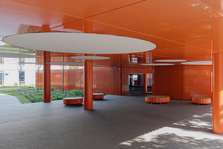 Schon beim Ankommen setzen modernisierte Eingänge, klare Signaletik und aufgewertete Fassaden neue Akzente. Begrünte Außenanlagen und Dachterrassen laden zum Verweilen ein, Sitz- und Kommunikationszonen fördern Austausch und gemeinsames Arbeiten. Innen entsteht durch frische Farb- und Lichtkonzepte, Motivwände und eine markante Lichtinstallation eine neue Atmosphäre. Mit der Marketinglounge im zweiten Obergeschoss – ausgestattet mit Loungebereichen, Meetingraum und Teeküche – entstehen Räume, die Offenheit und Kommunikation fördern.