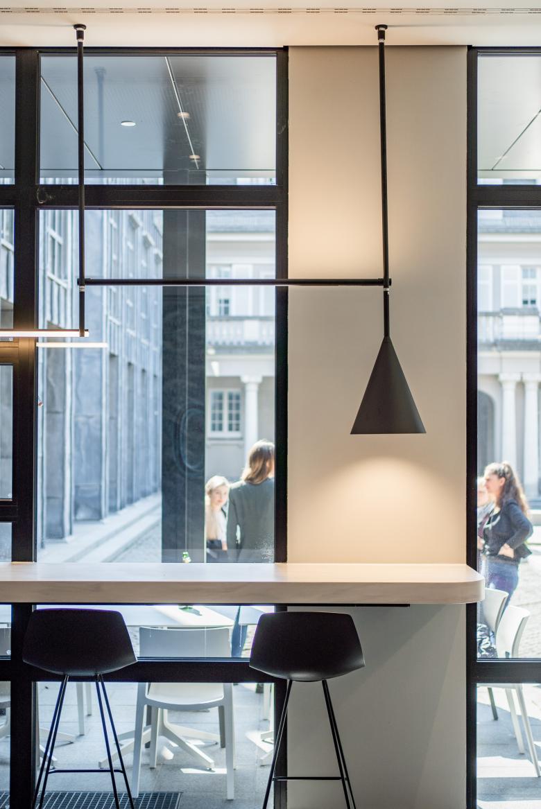 Die Verbindung der Kompetenzfelder von CSMM in der Revitalisierung, der effizienteren Flächennutzung durch einen neuen Grundriss und der Raumplanung erweist sich als Grundlage des Erfolgs: Der neu konzipierte Grundriss eröffnete eine Vielzahl gestalterischer Optionen für das Raumkonzept. Der Einsatz großzügiger Fenster und Glastrennwände mit markant gerundeten Ecken in der Innenzone sorgt für deutlich mehr Lichteinfall. Die Begegnungsräume profitieren von dem angenehmen Arbeitsklima, sie laden zu Gesprächen und zum informellen Austausch ein. Durch hochwertige Materialien und ein durchdachtes Farbkonzept kreierte CSMM hier eine exklusive Arbeitsatmosphäre. Das Kanzleiwesen stellt Arbeitsprozesse vor besondere Anforderungen. Vertraulichkeit hat hier eine andere Relevanz, da sie in Rückzugsräumen für konzentrierte Arbeit und Mandantengesprächen sichergestellt sein muss. Die Glastrennwände schaffen gleichermaßen Abgrenzung und Nähe, sie machen die Fläche vielseitig nutzbar.
