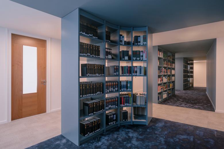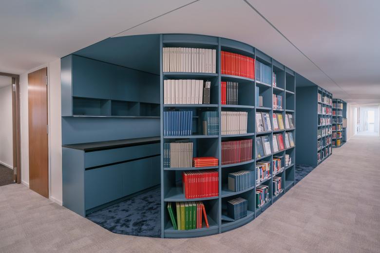 Die funktionale Transformation brachte entscheidende Verbesserungen. Trotz vieler Einzelbüros wurde eine offene, helle und gemeinschaftliche Arbeitsumgebung geschaffen. Herzstück ist das neue „Social Heart“, ein zentraler Begegnungsort für alle Mitarbeitenden. Die ehemals geschlossene Bibliothek wurde geöffnet und über zwei Etagen verteilt, Flure mit Glastrennwänden versehen und Zonen für Teeküchen, Druckerstationen und Bibliotheken integriert.