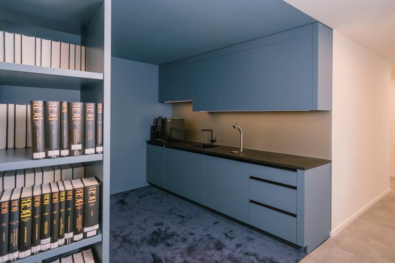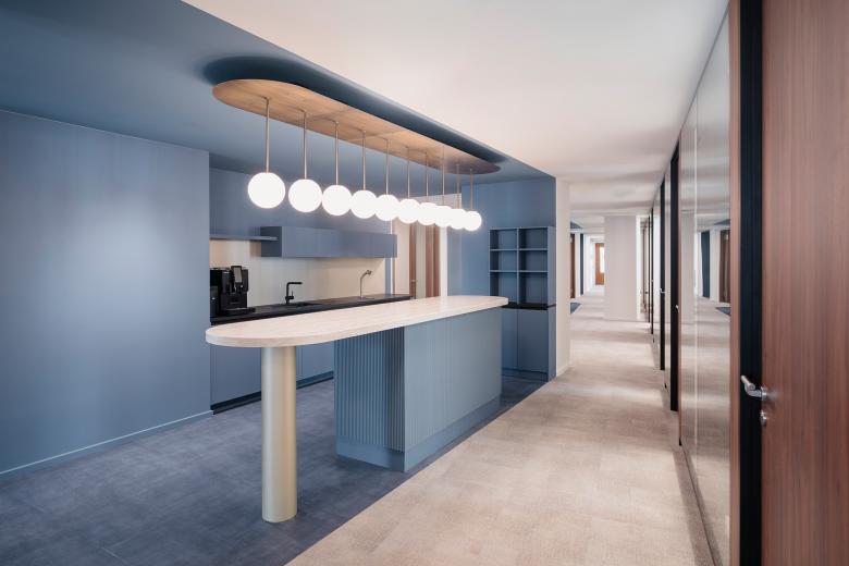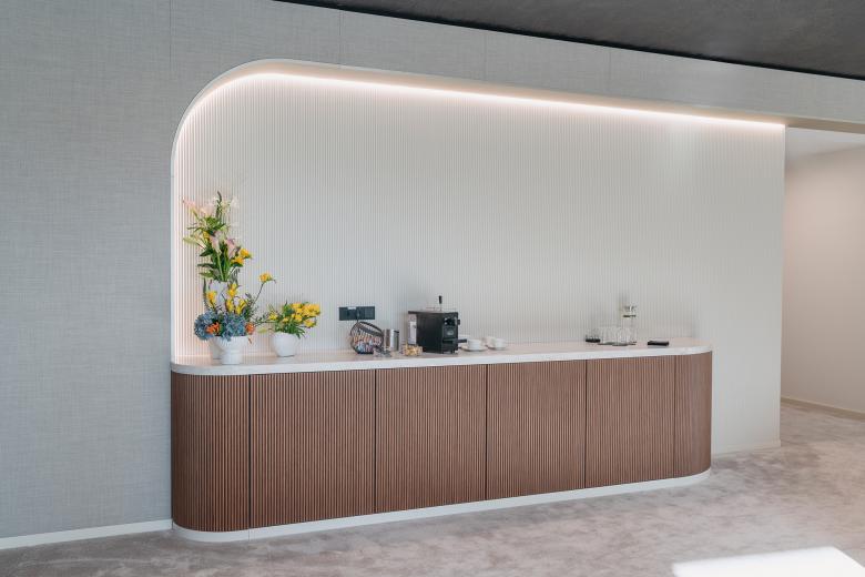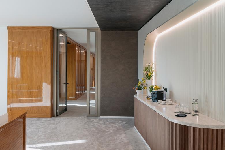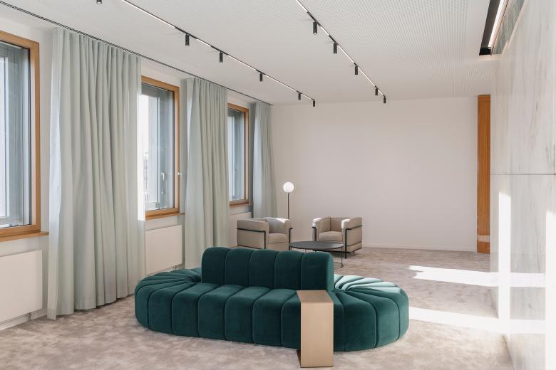 Von Beginn an entstand das Konzept in enger Abstimmung mit der Nachhaltigkeitsabteilung: Materialien, Möbel und Einbauten wurden weitgehend wiederverwendet. Elemente wie die Onyxwand, Zitronenholzpaneele und Beschläge von Kollhoff, Flurleuchten von Louis Poulsen sowie originale Türen blieben erhalten und wurden neu inszeniert.