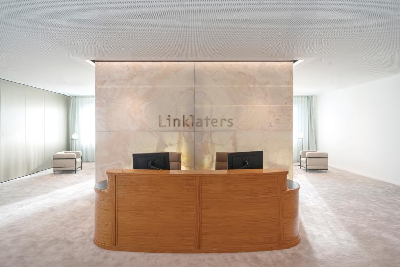 Der Mandantenbereich zitiert mit einem „nostalgischen Zwinkern“ die Eleganz der 1920er-Jahre und die Handschrift von Hans Kollhoff, während die Arbeitsbereiche im „sleek present“ zeitlos modern gestaltet sind. Gemeinschaftszonen im Stil einer „new identity“ bringen mit frischen Farben Offenheit und Austausch in den Arbeitsalltag. Die Corporate Identity von Linklaters fließt dezent ein – der markante Magentaton setzt Akzente, ohne zu dominieren.