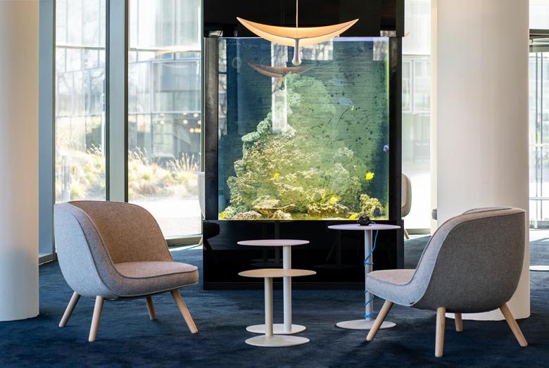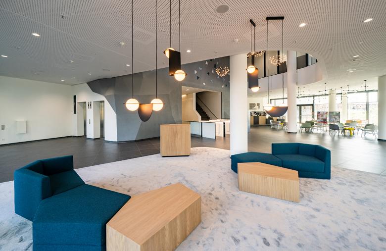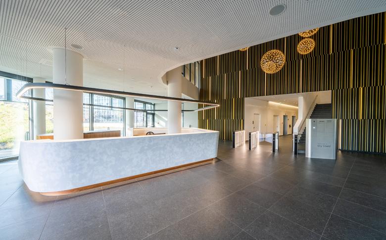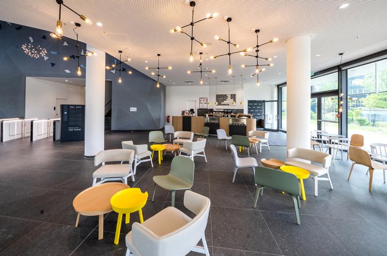 Our design is grounded in three core themes: diversity, a hybrid approach and a place of possibility. Diversity is reflected in the variety of different workplace options on offer. Not only the way we configured the space, but also our choice of materials and office furnishings reflect the needs of the various user groups. The look and feel in each tower is designed to foster a sense of belonging and express the respective corporate identity. A hybrid approach offers a mix of private offices and communal spaces as standard. Designed to be so-called “places of possibility”, all of the workplaces offer a standard floorplan, within which tenants have the flexibility to adapt the spaces to their own needs. The lobbies of the three towers each boast a unique interior, serving as a gateway to the different working worlds. In the Sky Tower, the atmosphere is quite upmarket and refined. The design, with its core wall made of brass, reception desk and lounge area featuring a fireplace, is branded “Executive & Stylish” and targeted towards more traditional tenants like law firms. The Blue Tower, by contrast, appeals to a more modern, streamlined user with its reception desk and its aquarium by the small seating area. “Young & Innovative” is the branding for the Star Tower, which is designed to attract younger users more familiar with agile ways of working. Even before you get to the upper floors, there is space for social and professional interaction in the lobby’s coffee bar and sofa lounge.