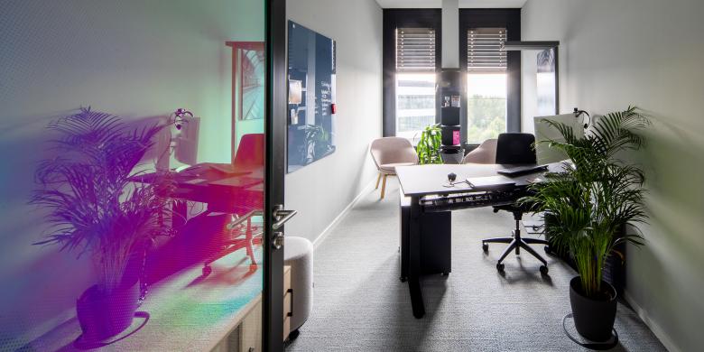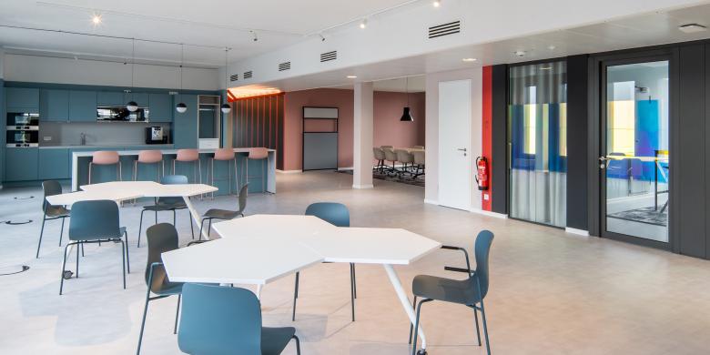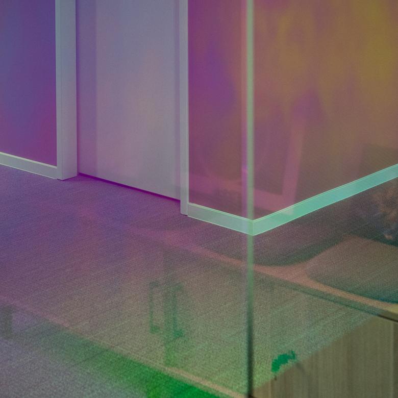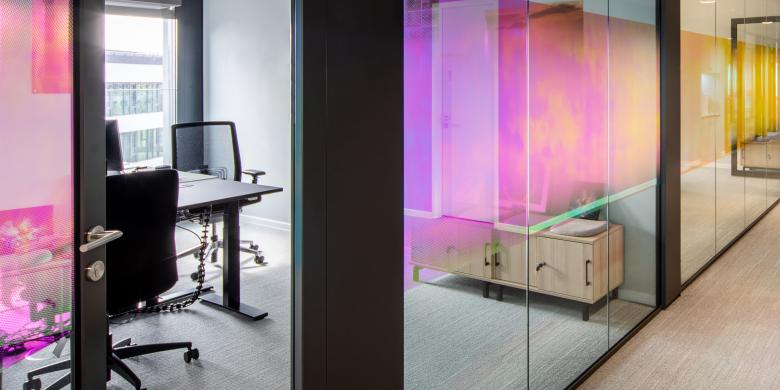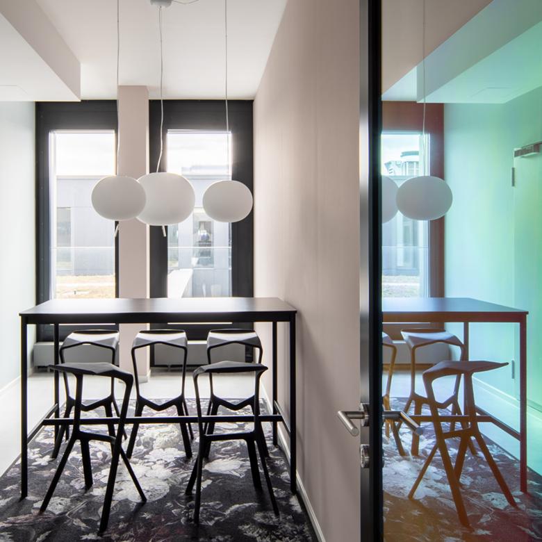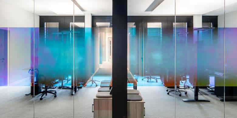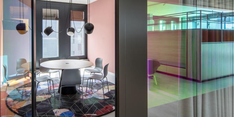 Die Einrichtung und Ausstattung der Räumlichkeiten stärkten das Teamwork von Beginn an. In diesem Office-Space fällt die Einarbeitung und Integration neuer Mitarbeiter viel leichter, die Stimmung ist sympathisch und locker. Der intelligente Mix aus agilen Gemeinschafts- und Kreativitätsräumen stärkt die Zusammengehörigkeit. Auch die Farbkombination, für die sich Maxon entschieden hat, nimmt die Stimmungswelt des Unternehmens gekonnt auf. Von Blau bis Beige – das fast futuristische Farbkonzept der Räumlichkeiten des Unternehmens spiegelt die „Virtual Identity“ der Marke wider: Dabei ließ sich CSMM vom ursprünglichen Gebäude, einer alten Villa mit Pool, inspirieren. Diese erinnert an Meer und Strand und vermittelt dem Team somit ein gewisses Freiheitsgefühl. Transparente Glasdesign-Folien mit farbigen Regenbogeneffekten an den Wänden sorgen für wechselnde Farbstimmungen und -illusionen im Raum. Die Auswahl des Themas erfolgte unter Beteiligung des Teams. Für sie wollten wir eine entspannte Atmosphäre kreieren. Unser Ziel war dabei, ein Raumkonzept zu gestalten, das sich leicht an allen Standorten reproduzieren lässt, sodass sich jedes Teammitglied weltweit mit dem Unternehmen und seinen Wurzeln verbunden fühlen kann.