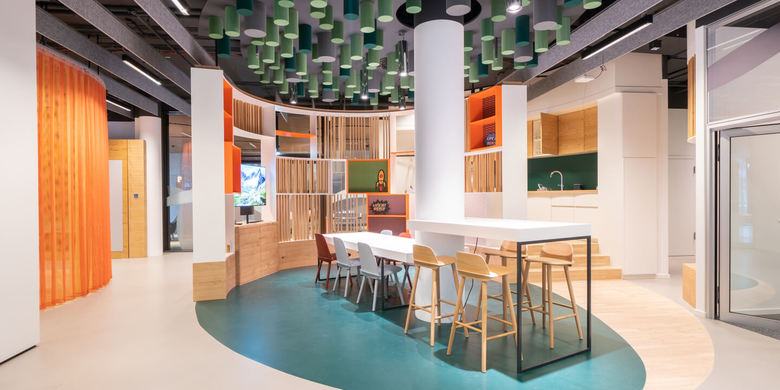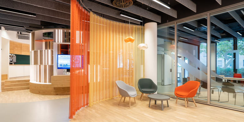 Mit den neuen Büroflächen für Reply im Münchener Arnulfpark schuf das Architektur- und Beratungsunternehmen CSMM ein Flagship, das für alle europäischen Standorte als Design Guide fungiert. Ziel des Konzeptes war die Verzimmerung der Räume aufzulösen eine Arbeitswelt zu entwickeln, die Co-Kreation und Innovation fördert und flexibel angepasst werden kann. Mit einem Nebeneinander von Büroräumen, abgetrennten Einzel- und Doppelzimmern sowie Lounges, Terrassen und einer Cafeteria als Rückzugs- und Kommunikationsorte schaffen die Gestalter*innen von CSMM qualitätvolle und individuell nach Bedarf nutzbare Arbeitsräume für die Mitarbeiter*innen. Gemeinsam mit Reply wurde ein Farb- und Materialkonzept entwickelt, das als Corporate Design in allen Standorten verwendet wird und trotzdem Raum für individuelle Akzente lässt. Am Münchner Standort sind das beispielsweise ausgefallene, großformatige und farbintensive Teppiche oder raumhohe, freistehende wie auch wandbegleitende „Living-Walls“. Regalsysteme dienen der optischen und räumliche Trennung von offenen Bereichen wie Kopier-Nischen und Archivflächen. Die neue Gestaltung erhöht die Aufenthaltsqualität insgesamt. Sie lädt die Mitarbeiter nicht nur dazu ein im Team zu arbeiten, sondern lässt auch Raum, um nach Feierabend Zeit miteinander zu verbringen.