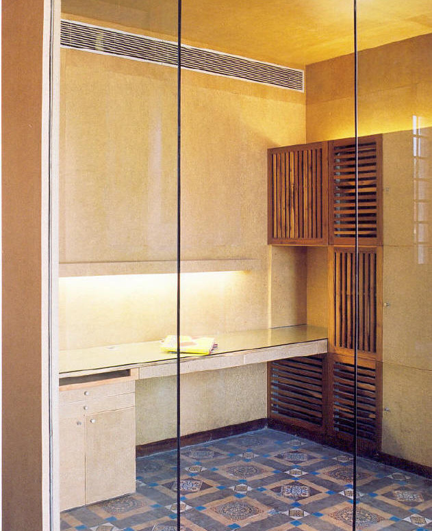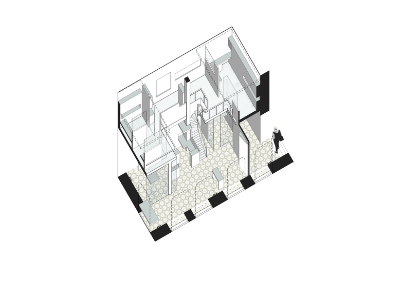 The new functions are accommodated in a mezzanine floor inserted along one edge of the space to maintain the original grandness of the space. The old shell has been restored through careful cleaning to reveal the original Minton tile flooring and the natural grain of the wooden shutters.