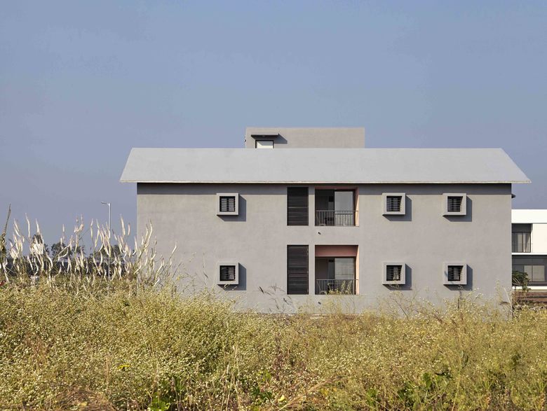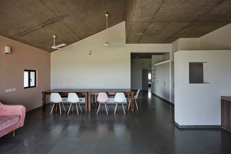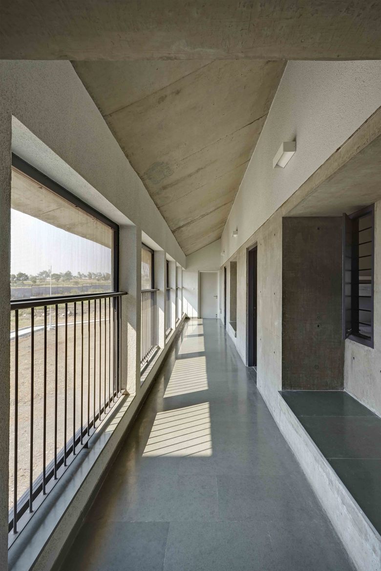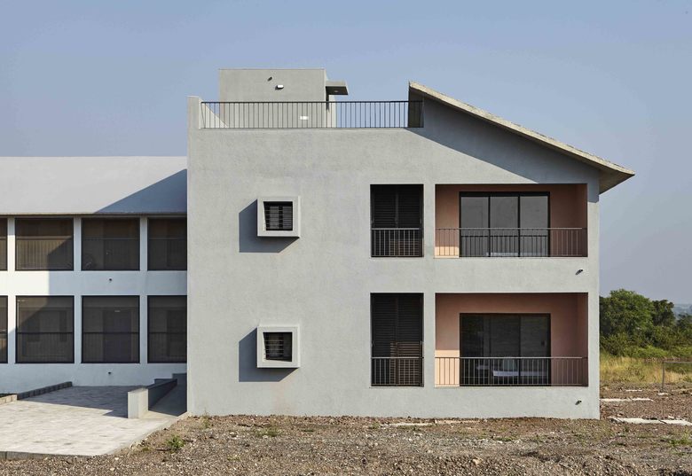 The building is designed in a L-shaped plan with the girls’ rooms in one wing and the caretaker’s rooms in the other wing connected by the pivot of the common living-dining-kitchen space.