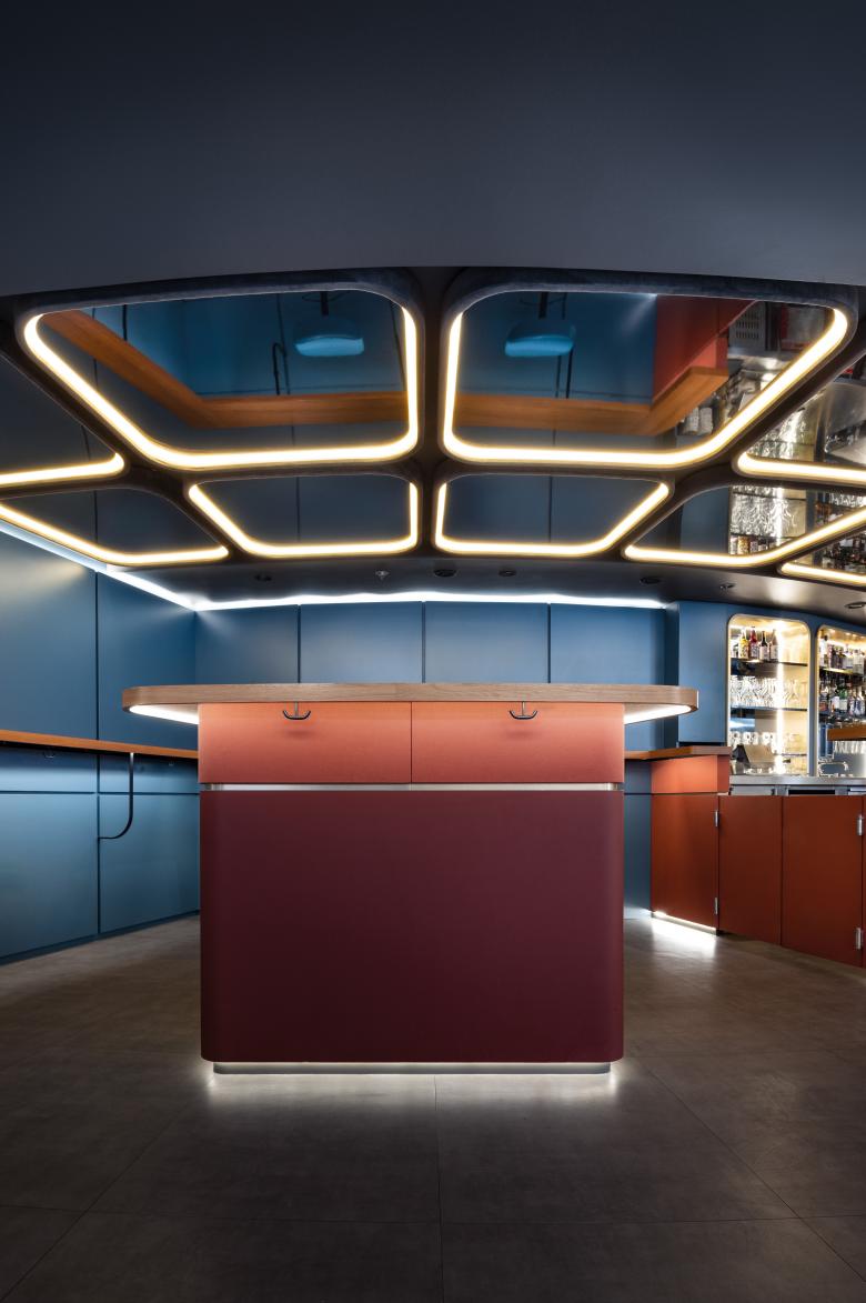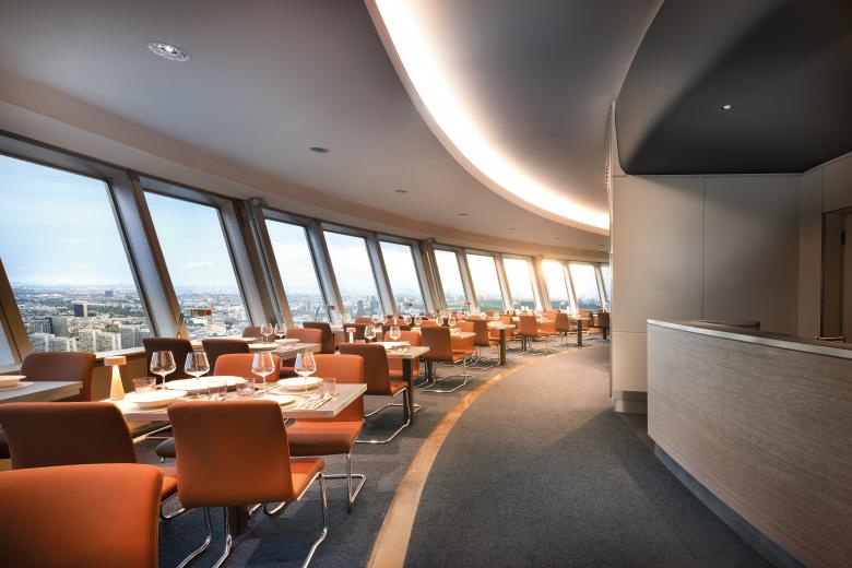 Based on a design concept centred on respect for the building’s architectural heritage, the exciting culinary venue covers an area of approx. 420 square metres, sensitively recreating the iconic look of the late 1960s. Working hand-in-hand with preservation authorities to maintain the tower’s historic structure gave rise to an overall concept that embraces the architecture, interprets it spatially and recasts its singular atmosphere.
