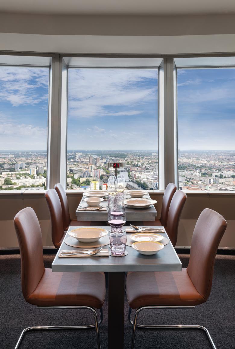 Rotating 207 metres above the German capital, the Sphere Tim Raue restaurant adds a new architectural, culinary and cultural dimension to Berlin’s iconic TV Tower. The listed tower sphere is now home to a place that preserves history while also exploring new horizons. A holistic interior design concept by Dittel Architekten and the culinary signature of renowned chef Tim Raue fuse together to create a space that is so much more than a restaurant – and which has its own unique atmosphere and international flair.