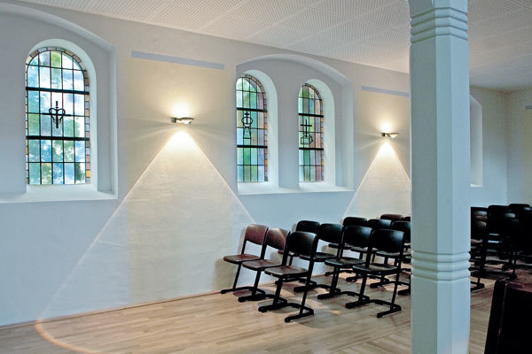 Das Farb- und Beleuchtungskonzept unterstützt die architektonische Raumgliederung der Martin-Luther-Kirche in Brambauer. Durch den Einsatz zurückhaltender Beleuchtungskörper tritt die ursprüngliche Architektur in den Vordergrund. Der Altarraum mit seinen Prinzipalstücken und der kostbaren Glasmalerei entfaltet seine besondere Wirkung unter dem Vierungsgewölbe.