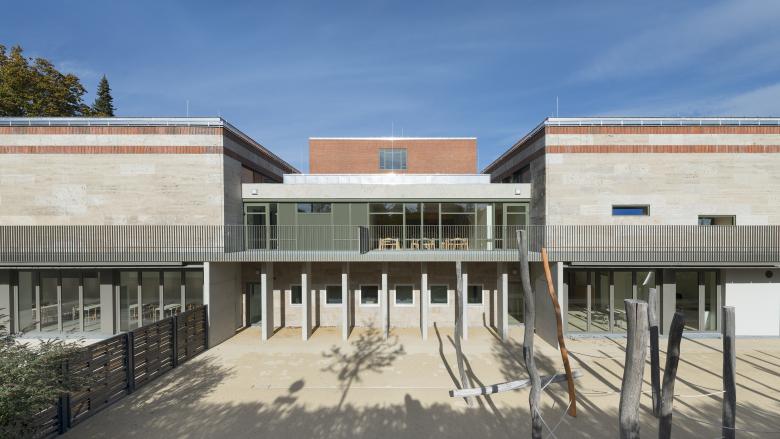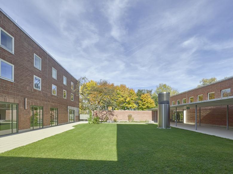 Die größte Transformation erfuhr das Hörsaalgebäude: Aus den nicht mehr nutzbaren Hörsälen wurden eine zeitgemäße Mensa mit Küche sowie eine Kindertagesstätte. Die ursprünglichen Raumhöhen bleiben spürbar und vermitteln den Charakter des Bestands. Damit wird das Bayernkolleg Augsburg zu einem Vorzeigeprojekt für nachhaltigen Bildungsbau, in dem Umbau, Denkmalpflege und Zukunft des Lernens zusammenfinden.