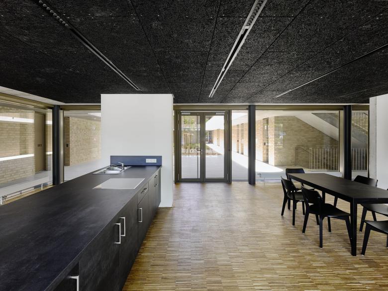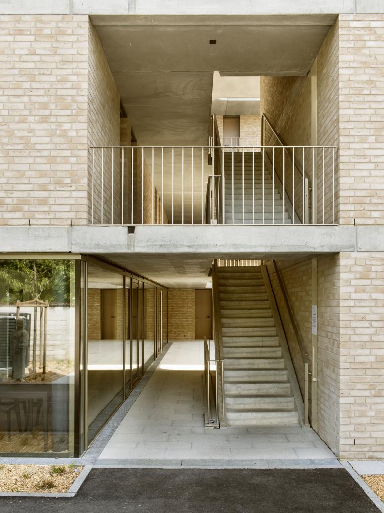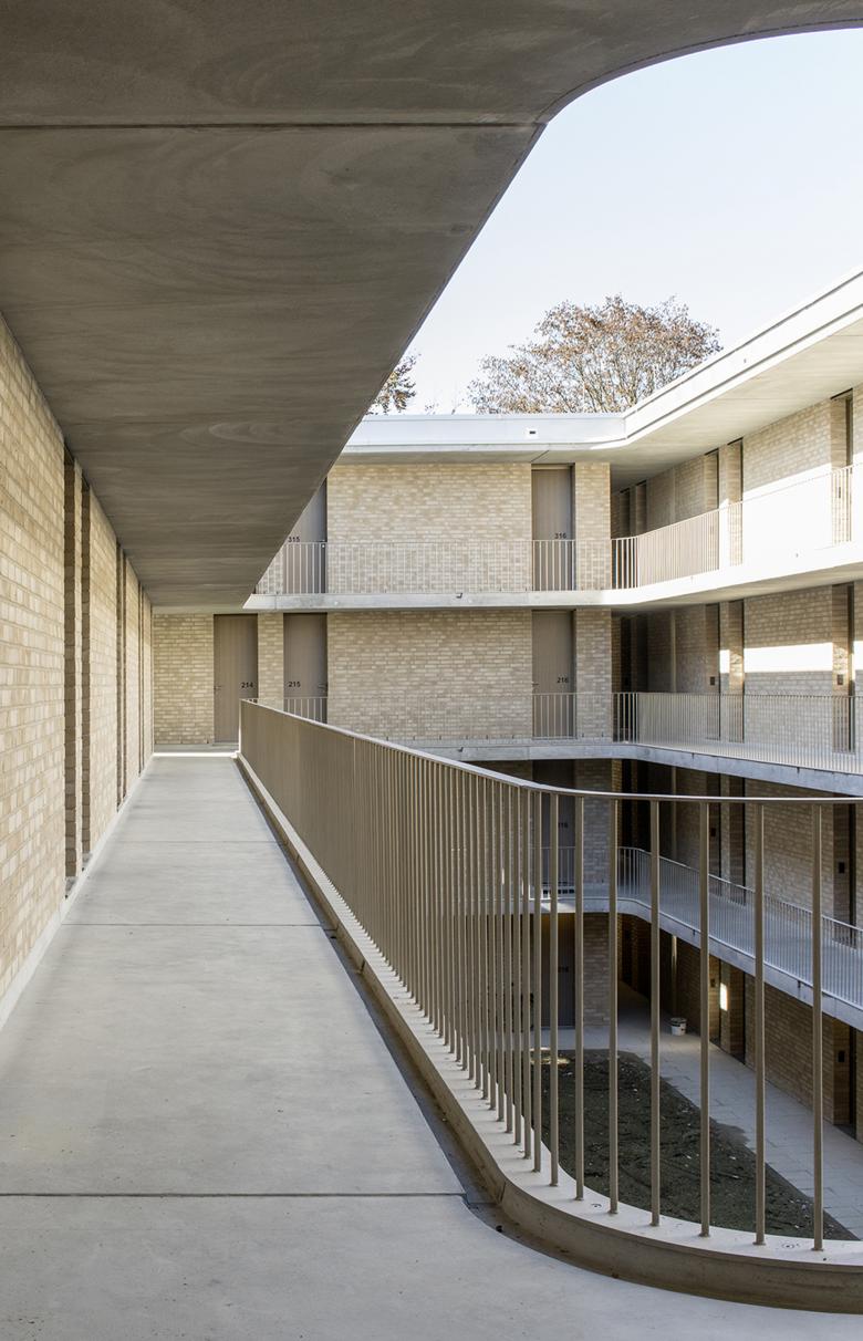 Die Erschließung des Gebäudes erfolgt barrierefrei über die Straße Auf der Schanz. Im Erdgeschoss befindet sich das barrierefreie Zimmer, erste Einheiten der Studentenappartements, der Gemeinschaftsraum für die Bewohner, sowie ein großzügiger Ankommensbereich. Die geschickte Anordnung der vier Bausteine entlang der Außenseiten des Gebäudes ermöglicht das Aufbrechen des Volumens. Über zwei vertikale Erschließungen gelangt man in die darüber liegenden Geschosse. Über den Innenhof ist für die Bewohner stets die Möglichkeit zur Kommunikation und zum Verweilen gegeben. Die Appartements sind klar und einheitlich strukturiert. Sie verfügen über zwei Zonen, dem Eingangsbereich mit Küchenzeile und Nasszelle sowie dem Wohnraum.