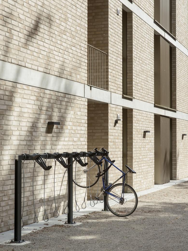 Trotz der knappen vorhandenen Flächen entstehen attraktive und vielfältig nutzbare Freiräume. Der Baumbestand bleibt fast vollständig erhalten und wird in das Freiflächenkonzept integriert. Durch die ökonomische Anordnung des Erschließungsbereichs werden die Apartments nicht vom Verkehr belastet. Auf eine geringe Oberflächenversiegelung wird besonderer Wert gelegt. Der Eingangsplatz besteht aus einer Mischfläche für Fuß- und Fahrverkehr, neben dem Fahrradhaus und den Müll / Wertstoffschränken werden hier die 24 PKW Stellplätze nachgewiesen. Das Aktivband ist nördlich des Gebäudes angeordnet und beinhaltet Sport- und Bewegungsangebote wie Basketball und Badminton. Sitzdecks unterbrechen und gliedern die einzelnen Aktivzonen. An der südwestlichen Lichtung markiert ein Grillplatz mit Sitz- und Liegedecks entlang der bestehenden Mauer den Gemeinschaftsbereich: ein Ort für Treffen, Kommunikation und Gemeinschaft. An der südlichen Flurgrenze werden für die Bewohner schmale Hochbeete für „Urban Gardening“ angeboten, um Obst und Gemüse ökologisch anbauen zu können.